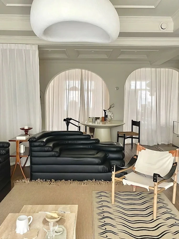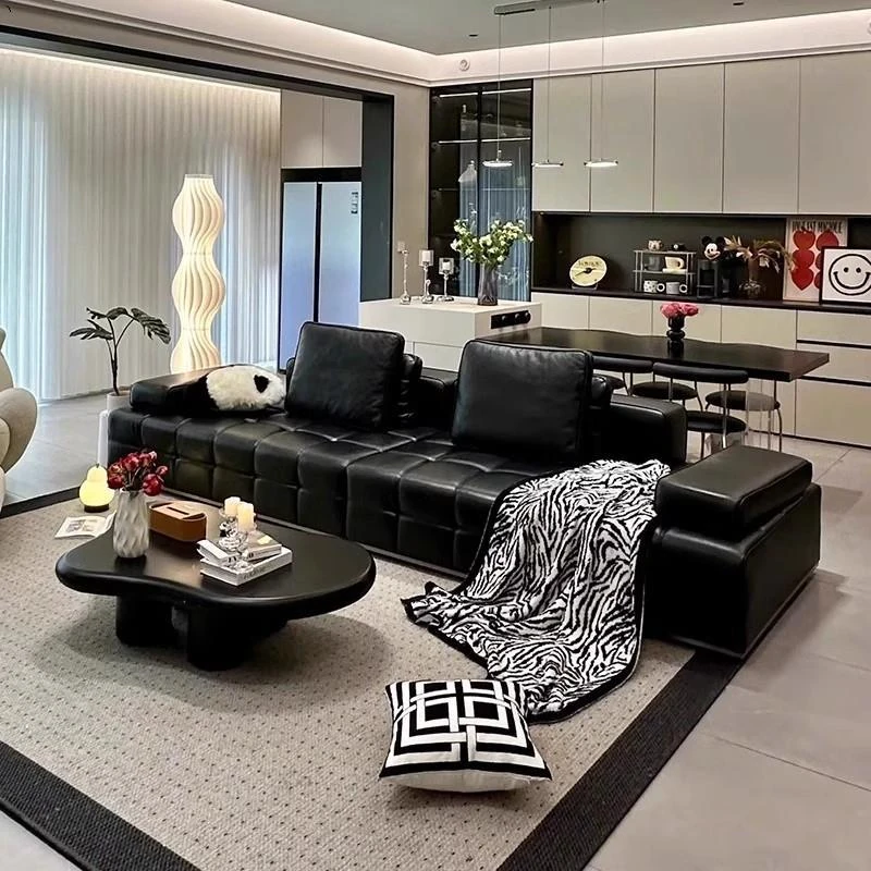 イタリアンミニマリズムのブラックシュガー雲のようなソファ - モダンでシンプルなデザイン、テクノロジー布製、リビングルームや小型住宅に最適な本革ソファ。快適さとスタイルを両立した理想のアイテムです。