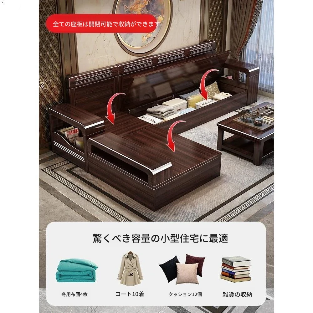 新中式デザインの無垢材ソファ - リビングにぴったり!冬夏兼用の収納付きソファとテーブルのセット。小型・中型の部屋にも最適で、スタイリッシュな空間を演出します。