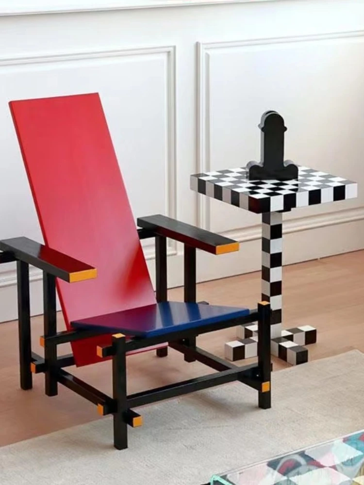 マスター設計の几何学的メンフィスコーヒーテーブル - 極簡約のチェスサイドテーブル、赤と青のアームチェア付き、リビングにぴったりな一人掛けソファ、アートなリラックス空間を演出!