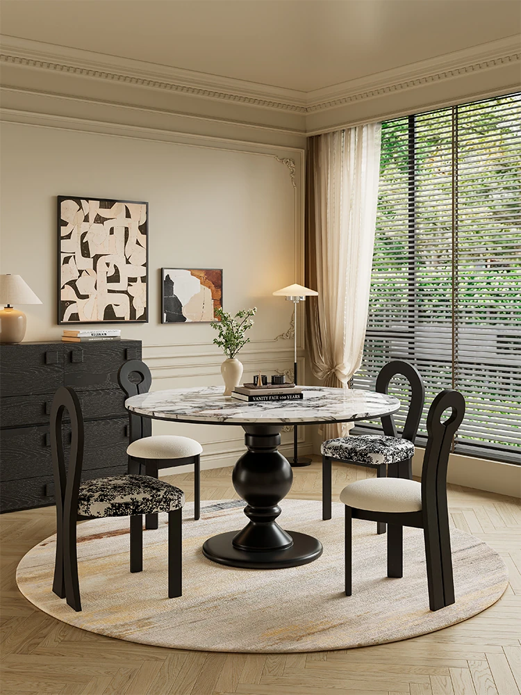 フランス風ヴィンテージ無垢材ボッテガ・ヴェネタ大理石ラウンドテーブル 2025年新作デザイナーズブラックダイニングチェアセット - 上質なデザインで、食卓を特別な空間に演出します。