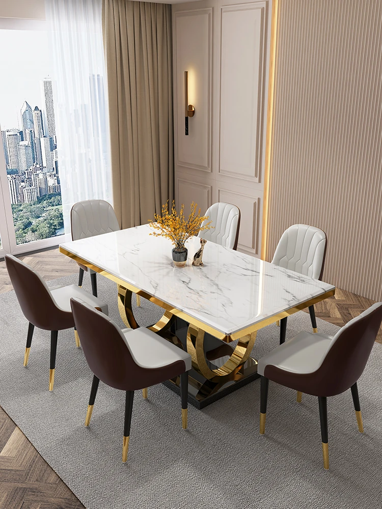 モダンミニマルなラグジュアリー大理石テーブルセット|洗練された石花模様の長方形ダイニングテーブル&チェア|現代的なシンプルさと高級感を兼ね備えた家庭用家具で、食卓を華やかに演出します!