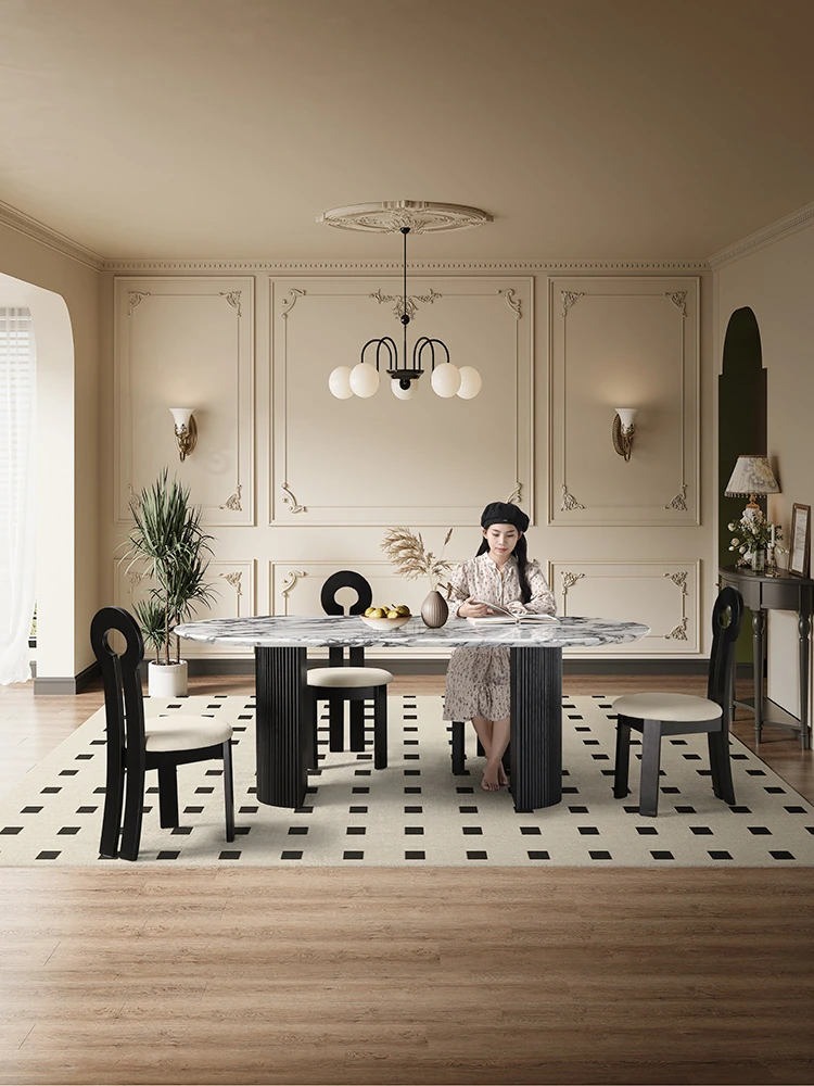 フランス風ラウンド大理石テーブル 厚手レトロデザイン 小型シンプルモダン楕円形ダイニングテーブルセット 家庭用に最適!おしゃれで機能的、食卓を華やかに彩ります。