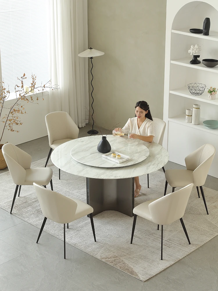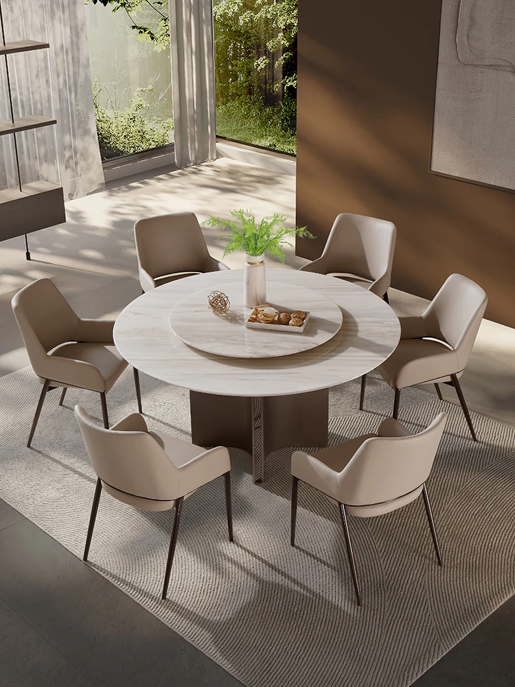 イタリアンモダンシンプル天然大理石ラウンドテーブル 高級ステンレス製 ヴィラ向け広々リビングにピッタリの円形ダイニングテーブルと椅子セットで、上質な空間を演出します!