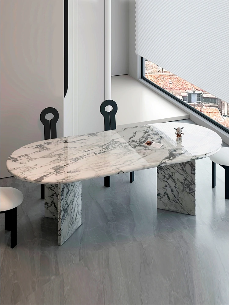 モダンシンプルな両端丸型大理石ダイニングテーブル フランス風エレガントオーバルデザイン 高級クリームテイストのおしゃれな家庭用テーブルで、インテリアに華やかさをプラス!