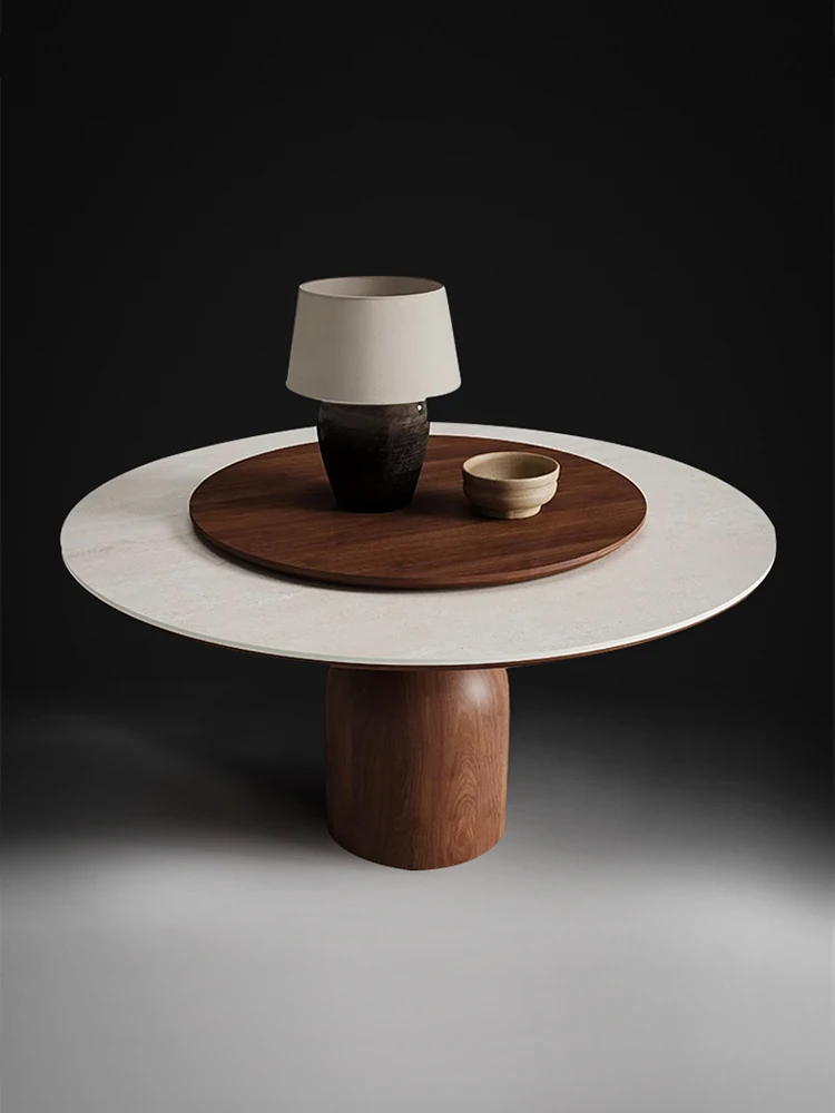 顔谕優品の無垢材ダイニングテーブル - 円形、回転プレート付き、和の侘び寂びデザイン。心地よい中世風の雰囲気を演出する、家族や友人との素敵な食卓を彩る一品です。