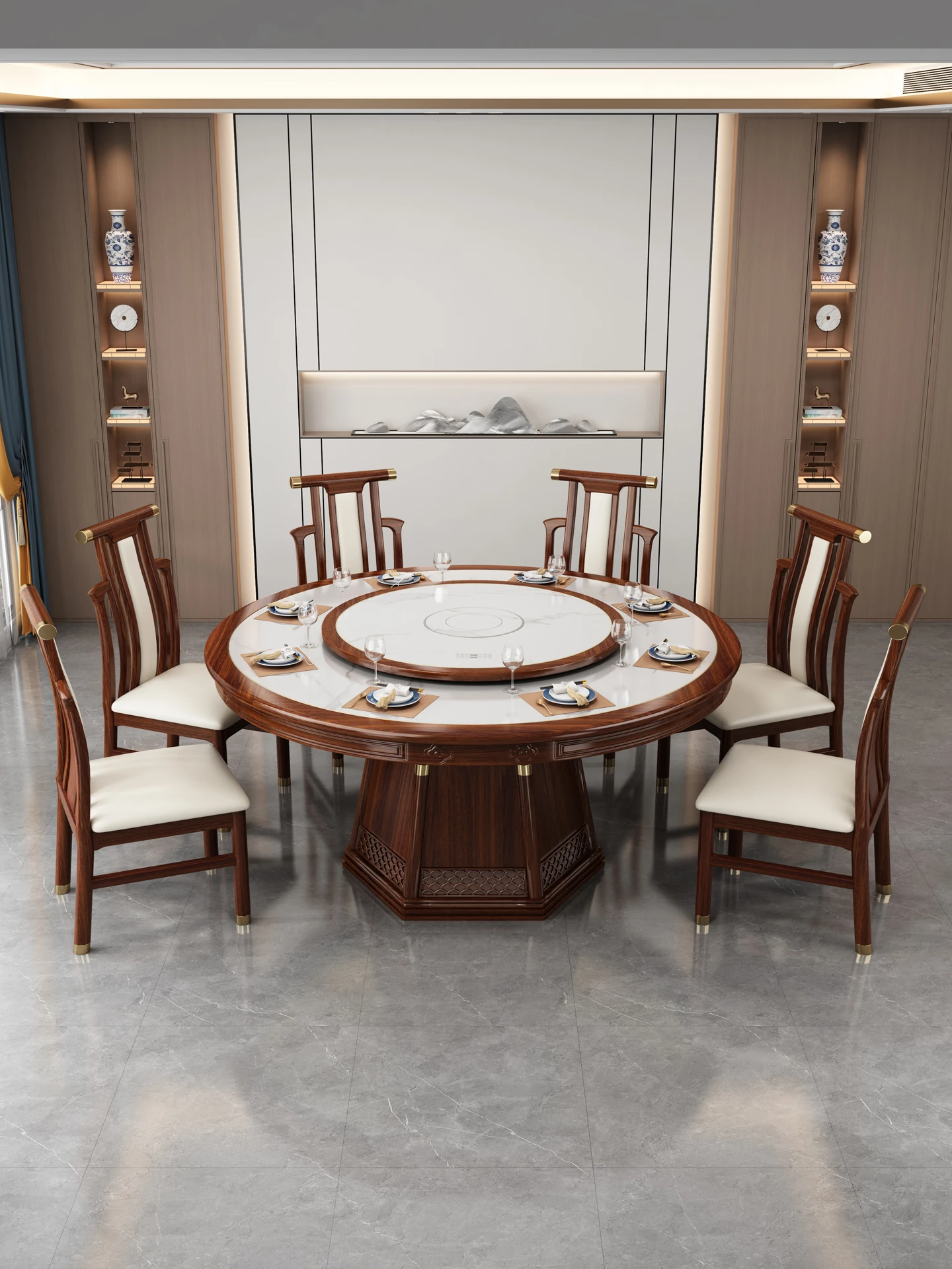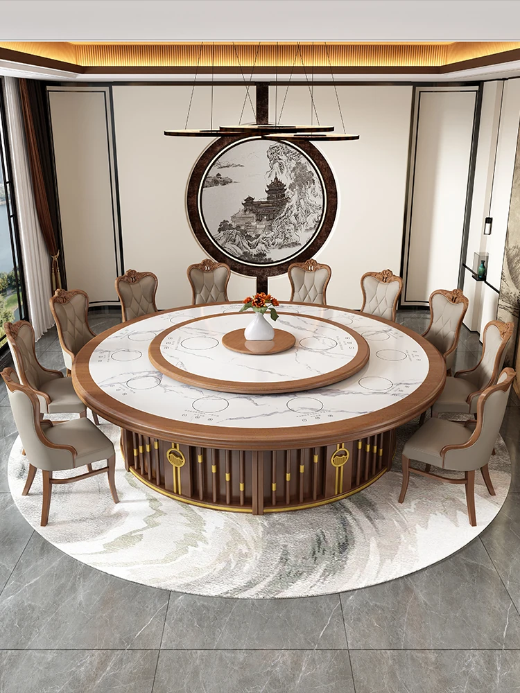 新中式高級感漂う実木ダイニングテーブル&チェアセット|18人対応|ホテル・レストラン向け|電動大円卓|3mのラグジュアリーな岩板テーブル|特別なひとときを演出!