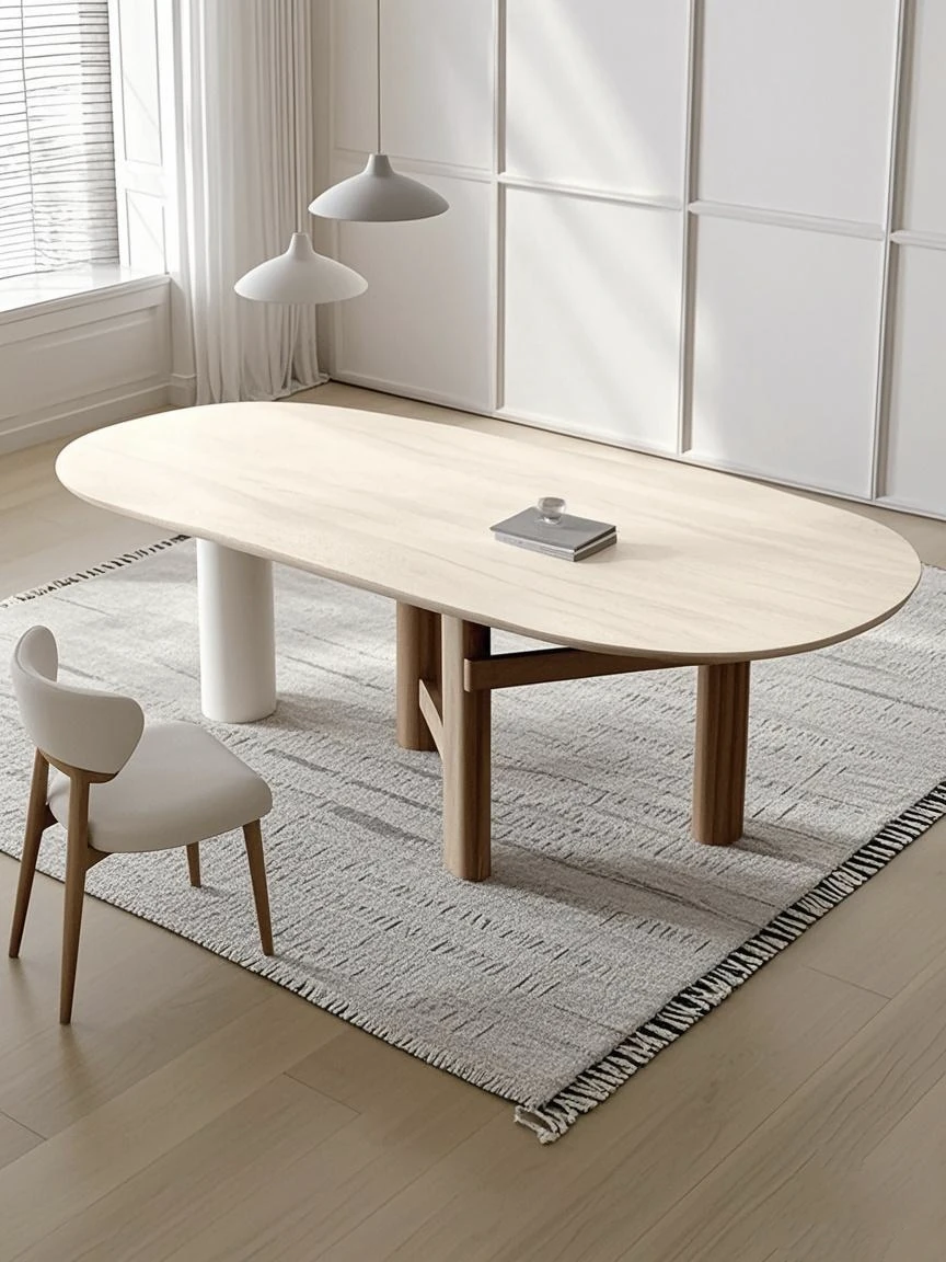 フランス風クリーム仕上げの天然木オーバルダイニングテーブル - モダンでシンプル、長いデザインの創造的な岩石テーブル。アートのような丸型で、食事の時間を特別に演出します。