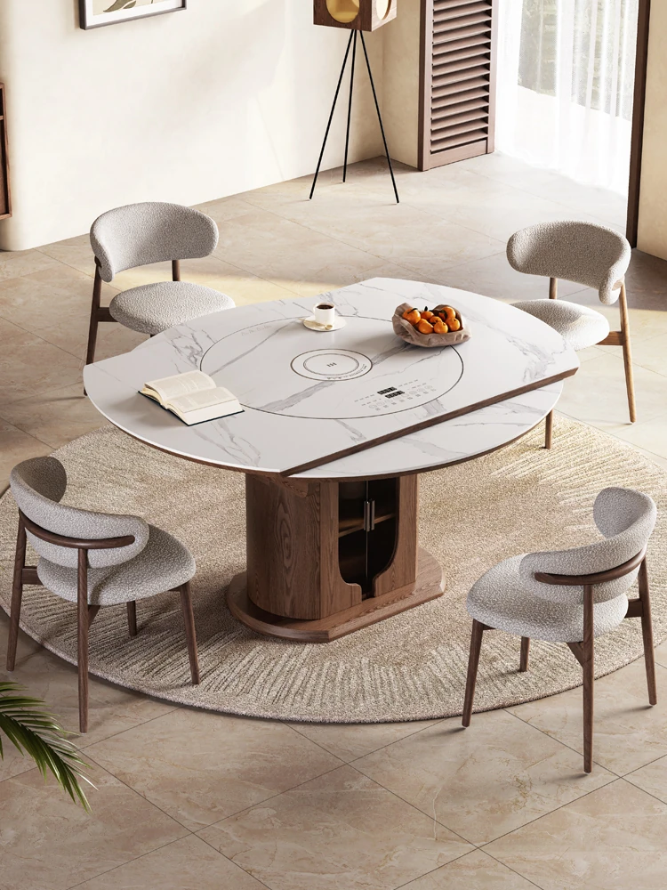 贅沢な中華風の伸縮式ラウンドワイングラス付き、岩板製のダイニングテーブル。内蔵の電磁炉と回転プレートで、実用性と美しさを兼ね備えた高級感溢れる無垢材の食卓をお楽しみください。