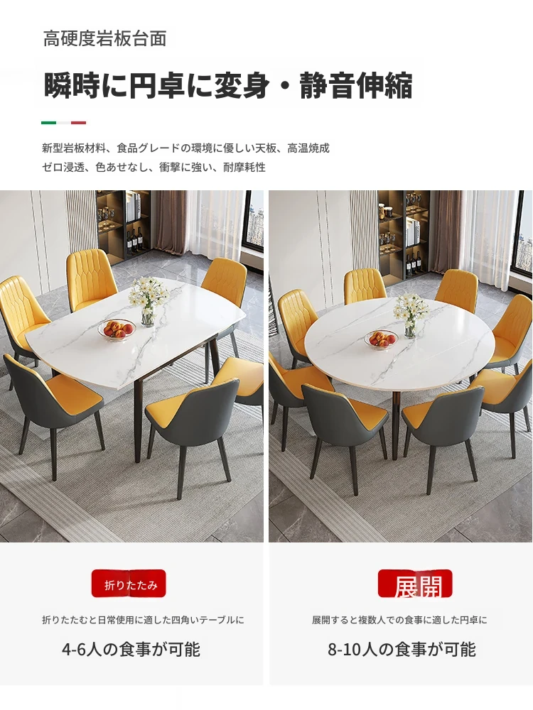 送料無料!新疆産の岩板を使用した現代的でシンプルな軽奢スタイルの折りたたみ伸縮可能な丸型ダイニングテーブルとチェアセット。小スペースにもぴったりで、家族や友人との食事を楽しむのに最適です!