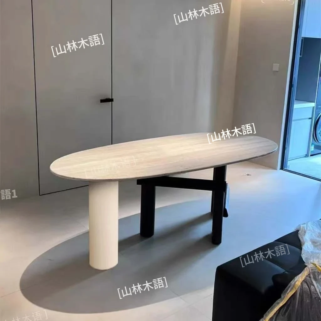 フランス風レトロ無垢材ダイニングテーブル - モダンクリームスタイルのアメリカン家庭用、楕円形の複合岩板デザイン、小スペースにもぴったり!おしゃれな食卓を演出します。