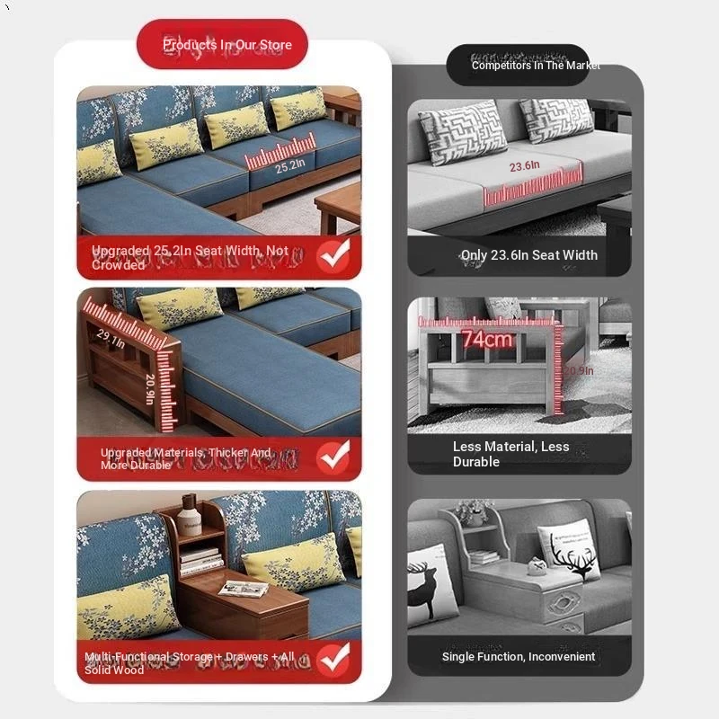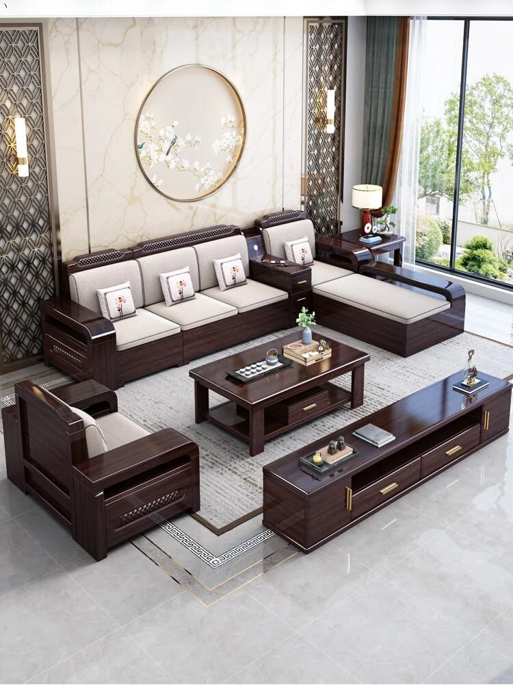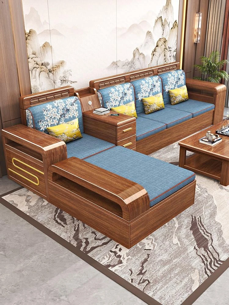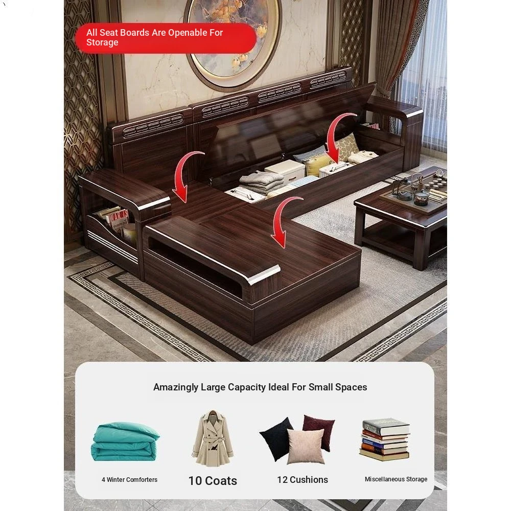 Walnut Wood Sofa - Modern Minimalist New Chinese Style Solid Wood Sectional Sofa Set for Living Room, Ideal for Small to Medium Spaces with Storage Solution