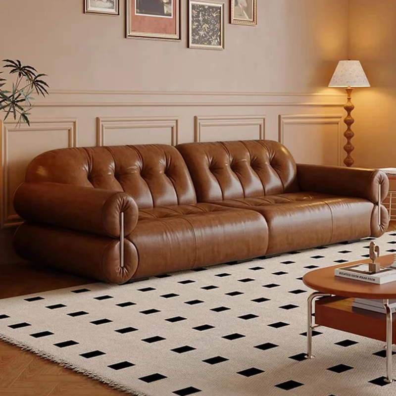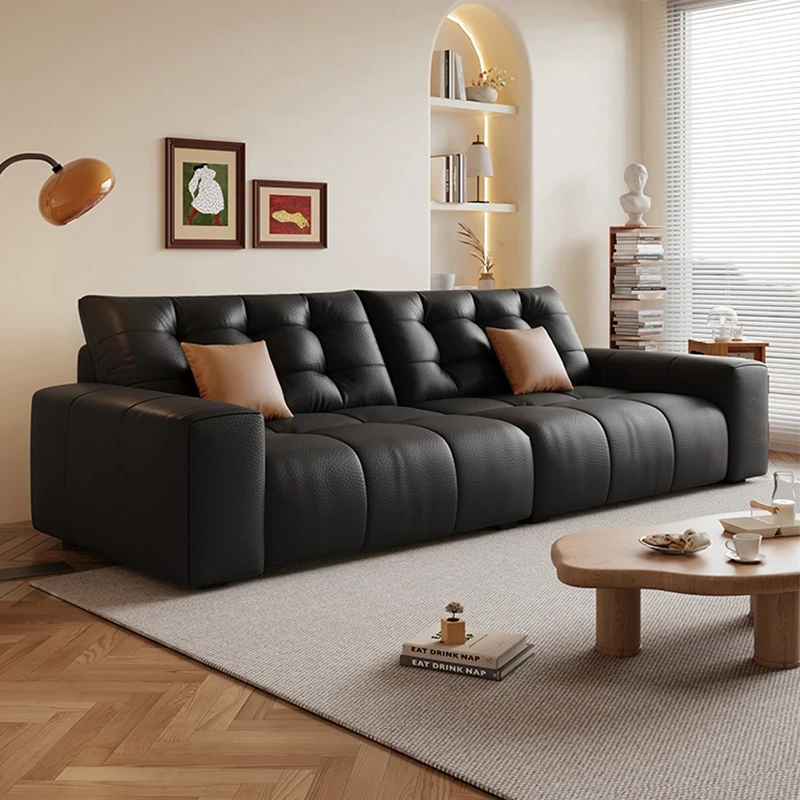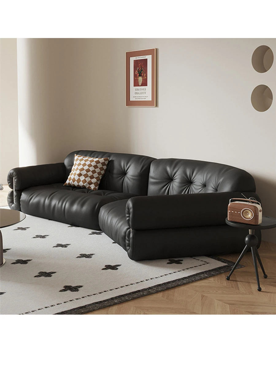 French Vintage Style Oil Wax Genuine Leather Black Sugar Cloud Sofa for Small Living Rooms - Modern Minimalist Design with High-Tech Fabric Upholstery