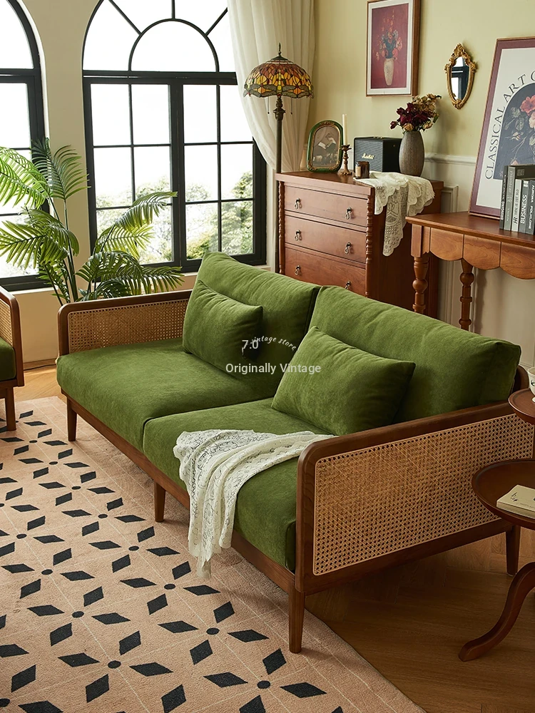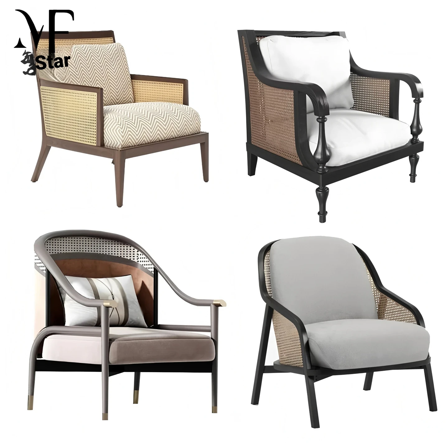 Vintage-Inspired Wooden Rattan Sofa Chair for Hotels and Guesthouses - Perfect for Reception Areas and Lounges, Blending Nordic Charm with Comfort and Style