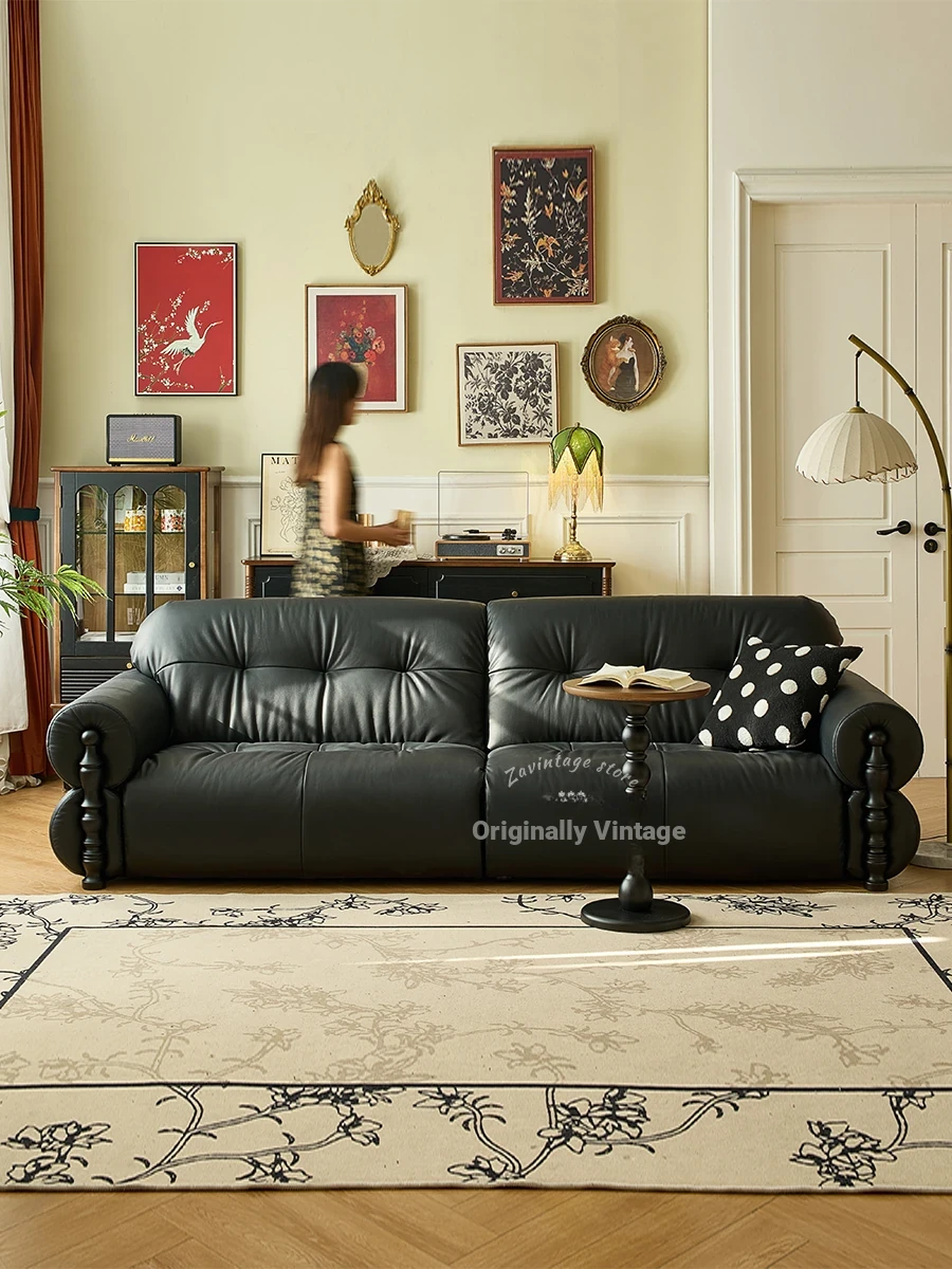 2025 New French Vintage Puff Real Leather Sofa - Italian Minimalist Straight Piano Key Black Sofa for Living Room
