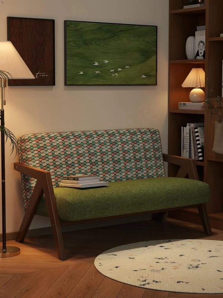 Vintage Solid Wood Double Sofa - Chic Fabric Couch for Small Apartments, Hotels & Airbnb. Perfect for Cozy Living Rooms and Compact Spaces!