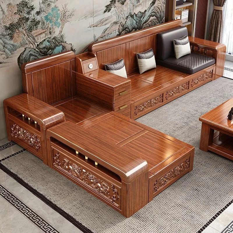 Modern Minimalist Solid Wood Sofa Set with Carved Design - Stylish Storage Corner Sofa for Small Living Rooms - Perfect for New Chinese Style Decor