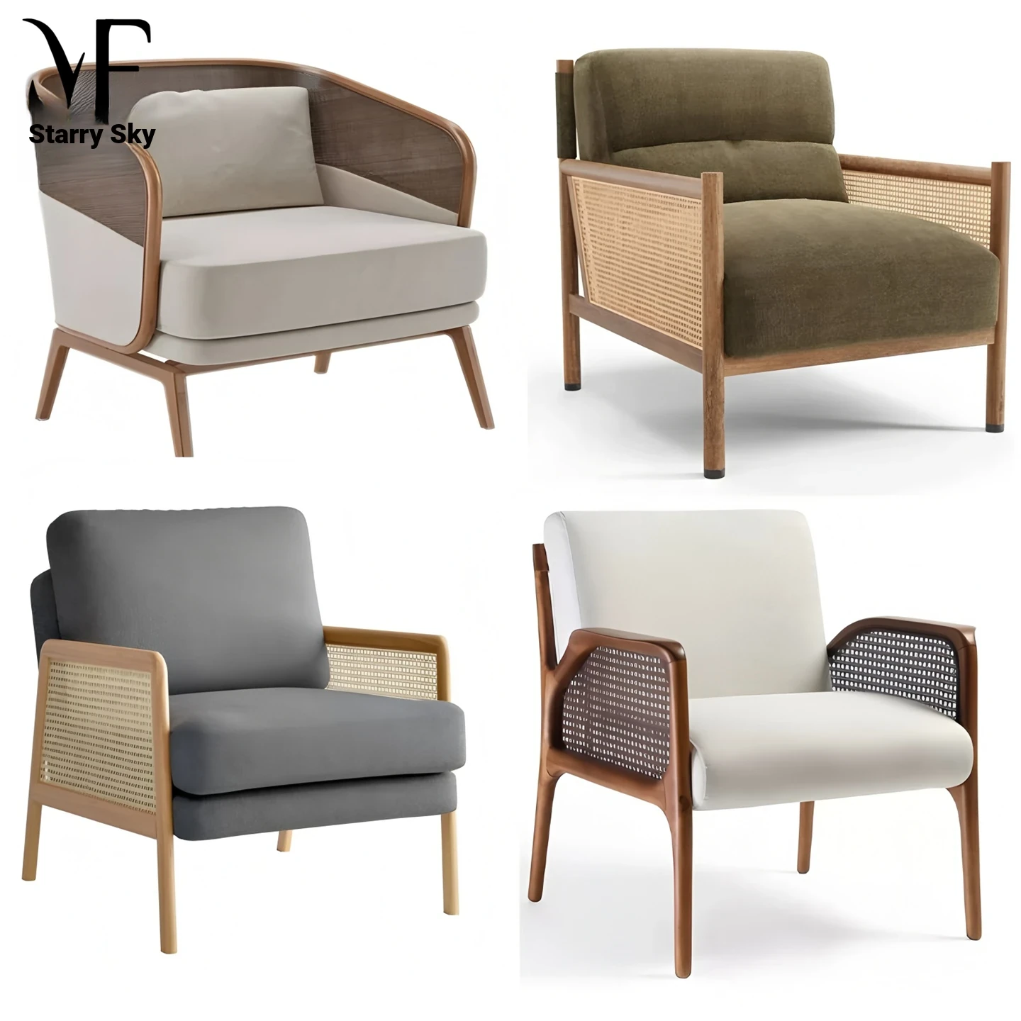 Designer Wabi-Sabi Style Leisure Chair - Vintage-Inspired Single Seat with Nordic Rattan and Solid Wood Sofa Chair for Hotel Lounges and Cozy Spaces