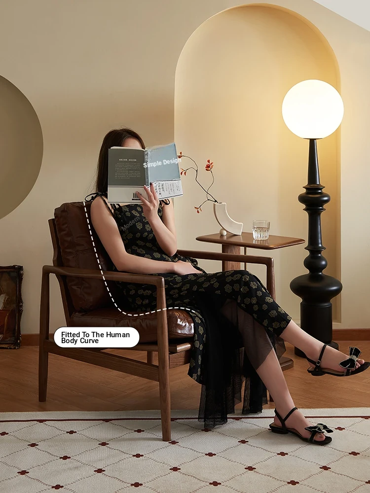 Designer Nordic Retro Waxed Leather Solid Wood Armchair - Perfect for Reading, Relaxing, and Stylish Décor for Your Living Room or Balcony.