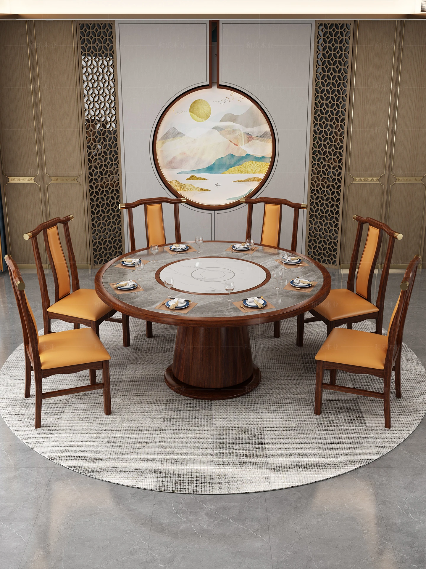 Elegant Round Solid Wood Dining Table with Rock Slab Top - Perfect for Hot Pot, Family Gatherings, and Restaurants. Features Built-in Induction Cooktop and Lazy Susan for Convenient Dining Experience. Ideal for Modern Chinese Style Homes and Hospitality