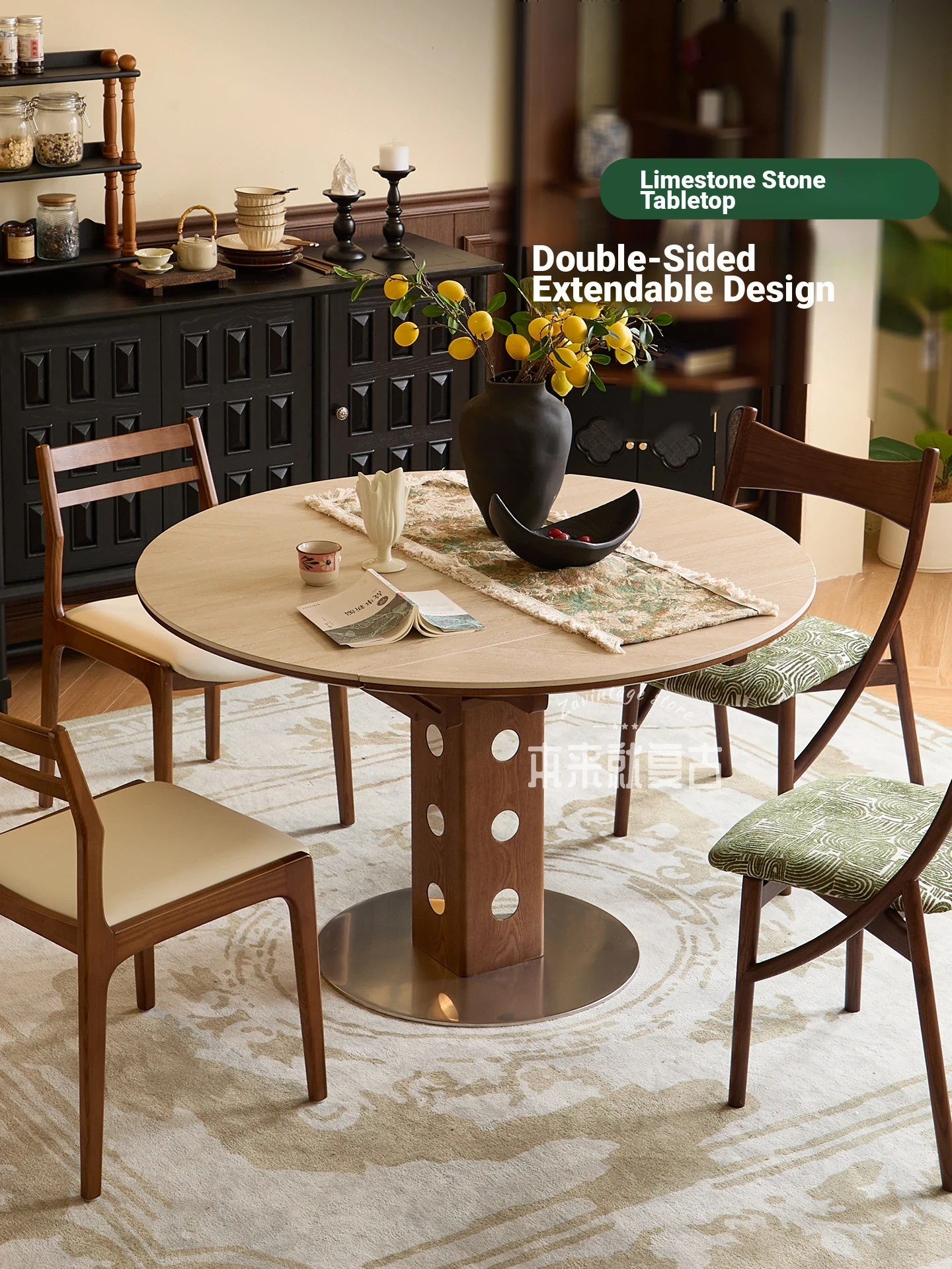 Vintage-Inspired Round Folding Dining Table Set for Small Spaces - Solid Wood with Rock Slab Top, Perfect for Living Rooms and Cozy Homes