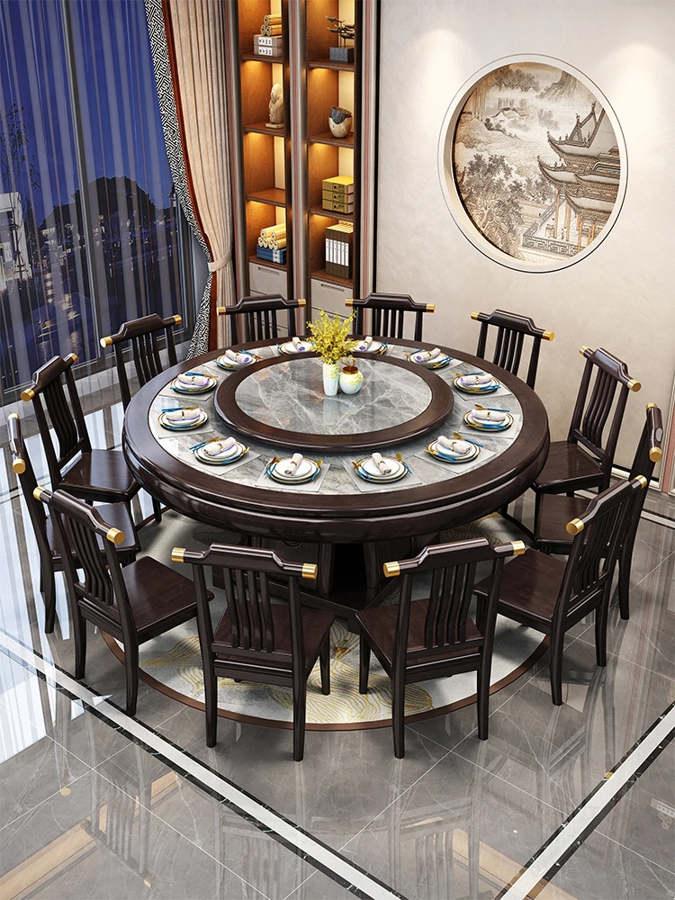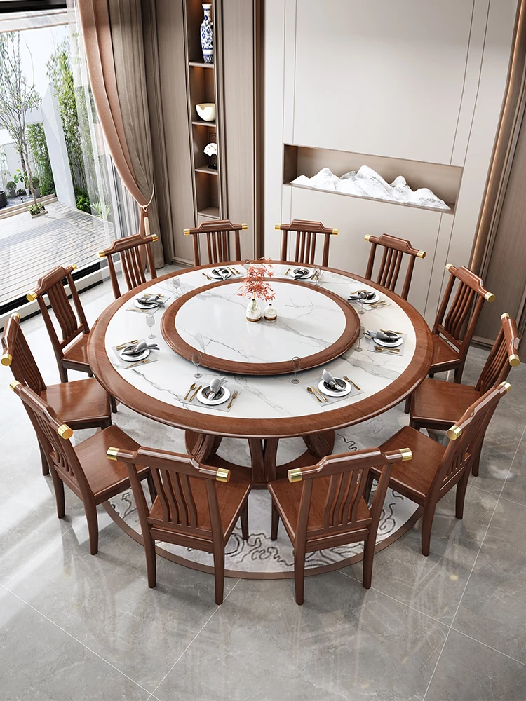 Premium Wenge Wood Round Dining Table with Inlaid Stone Top - Elegant New Chinese Style Solid Wood Dining Table for Living Room and Restaurants, Perfect for Electric Rotation