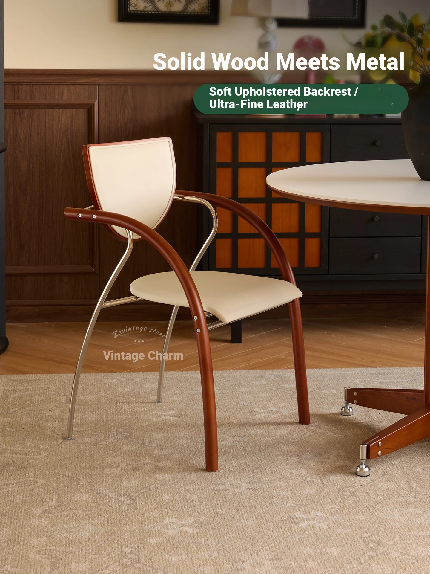 French Vintage Solid Wood Bauhaus Dining Chair with Leather Upholstered Backrest and Armrests - Retro Creative Lounge Chair for Home Use