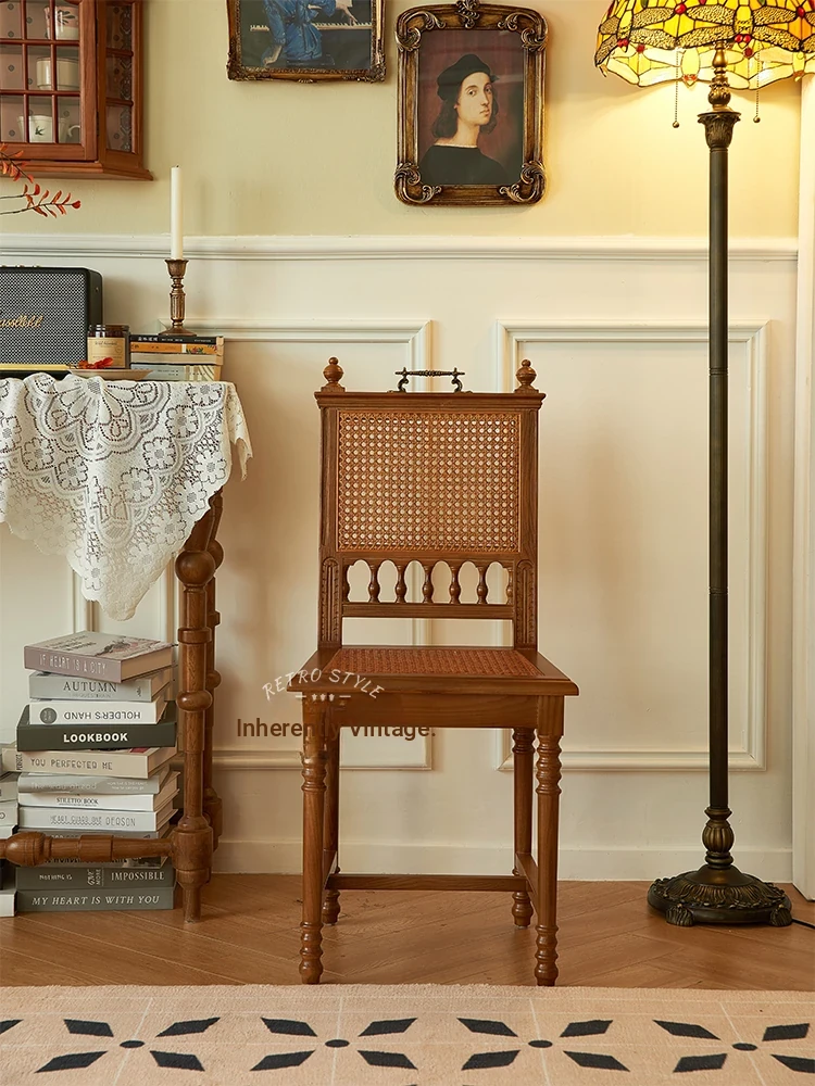 French Vintage Rattan Dining Chair - Solid Wood Backrest, Perfect for Small Spaces, Ideal for Study Desks and Chic Makeup Vanities