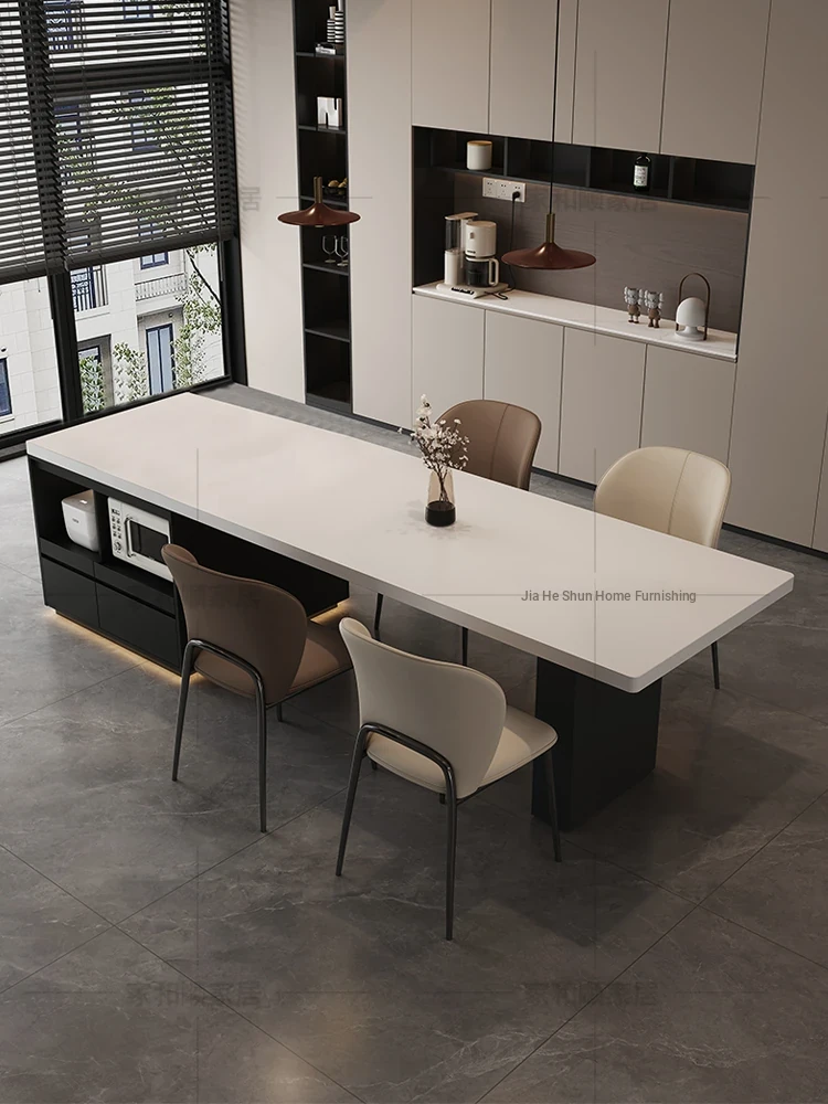 Minimalist Integrated Kitchen Island Dining Table with Microwave – Pure White Rock Plate with Multifunctional Design and Chairs for Home Use