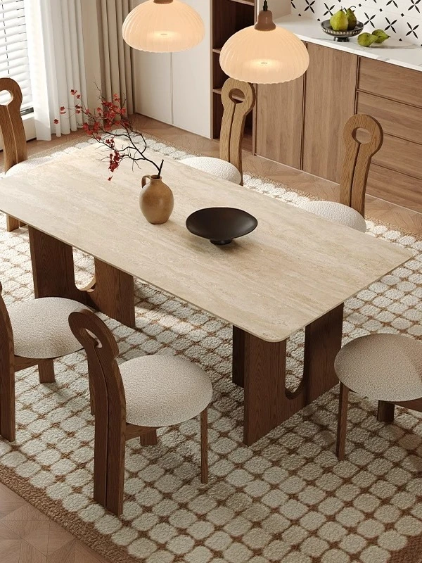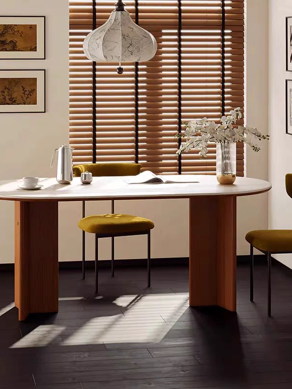 French Cream-style Solid Wood Oval Dining Table with Artistic Rock Surface - Modern Minimalist Long Table for Creative Dining Experience