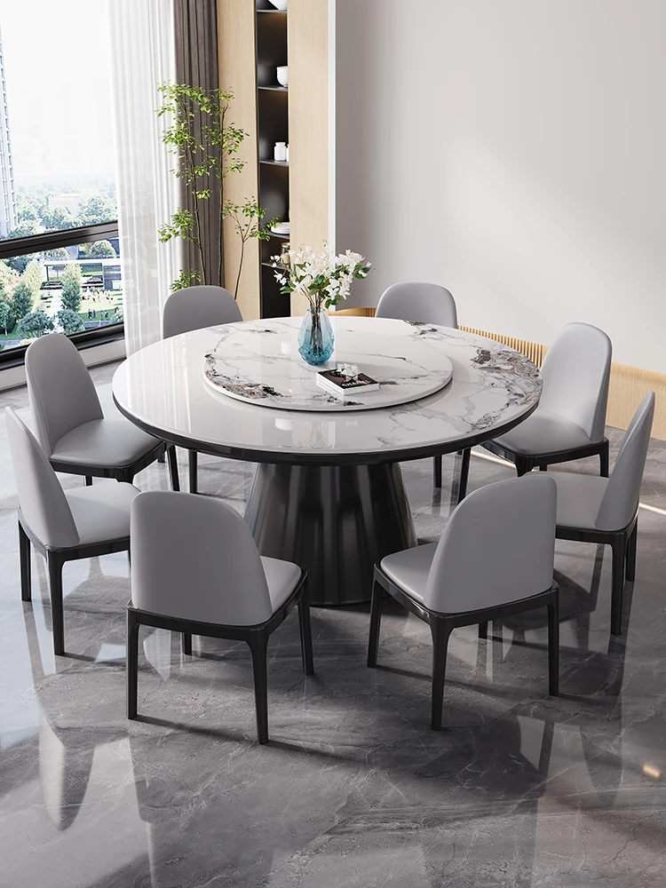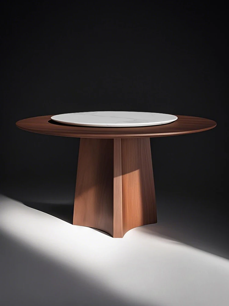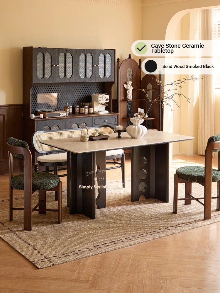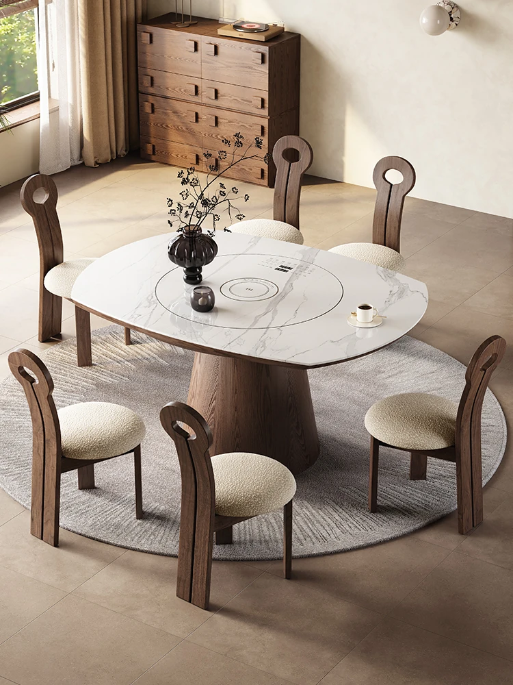 Luxury Retro Rock Plate Solid Wood Dining Table for Small Homes - Expandable with Built-in Turntable and Induction Cooker, Perfect for Cozy Meals