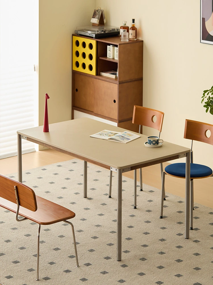 New Space | Bauhaus Vintage Style Dining Table Set - Matte Stainless Steel and Solid Wood Rectangular Table with Chairs