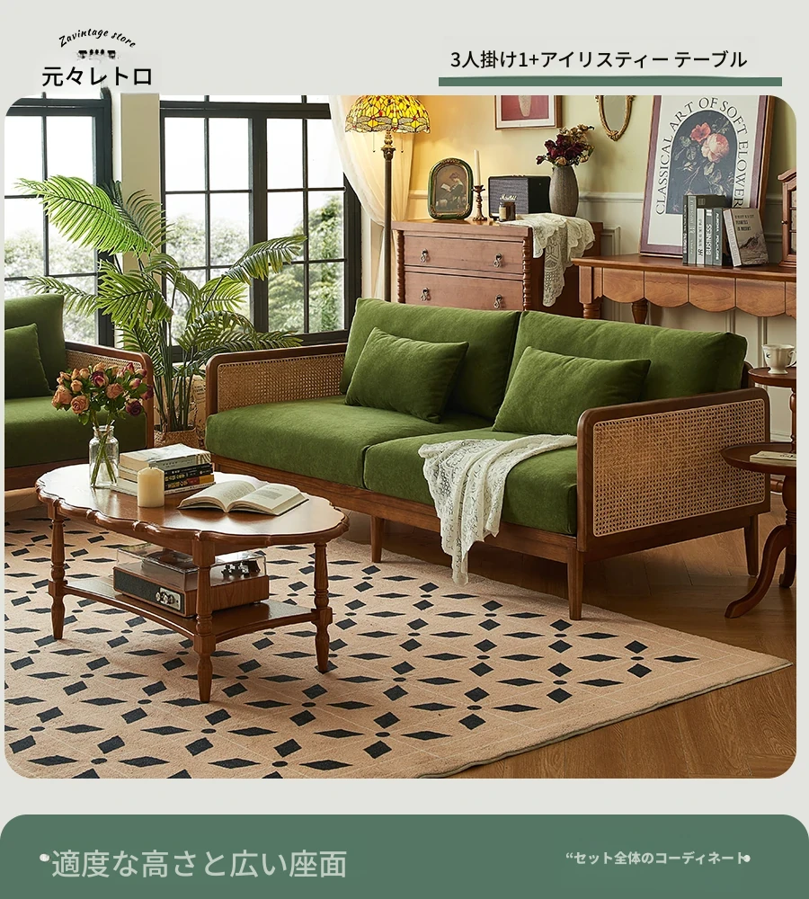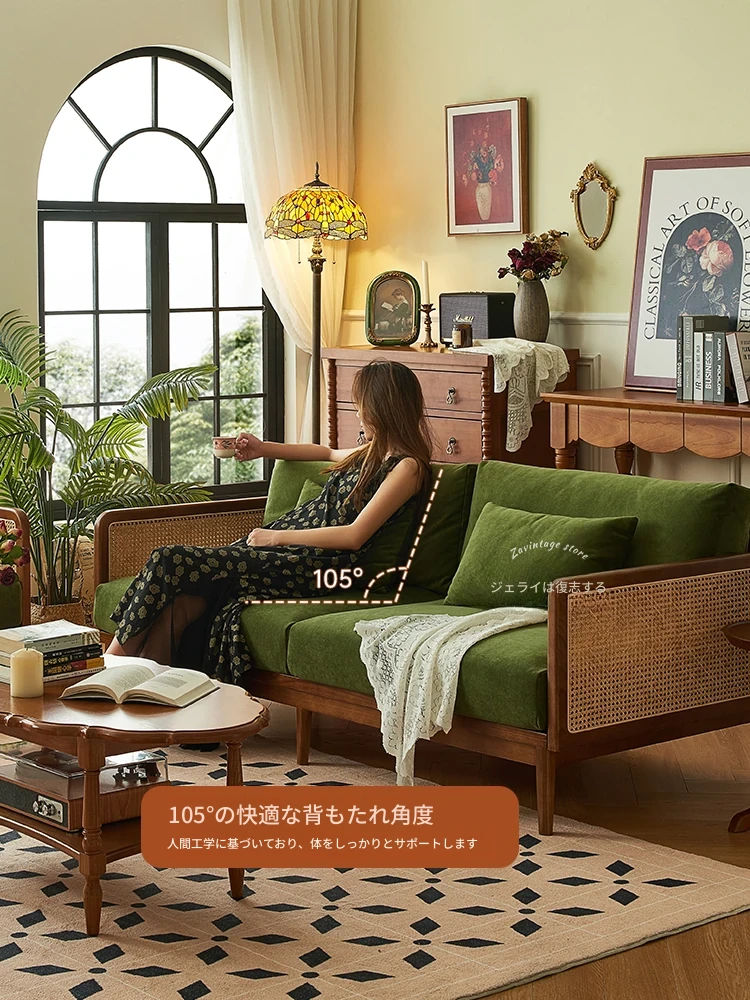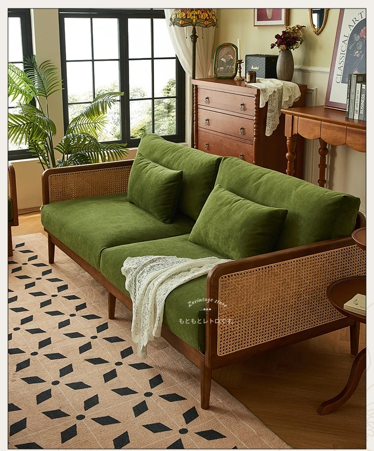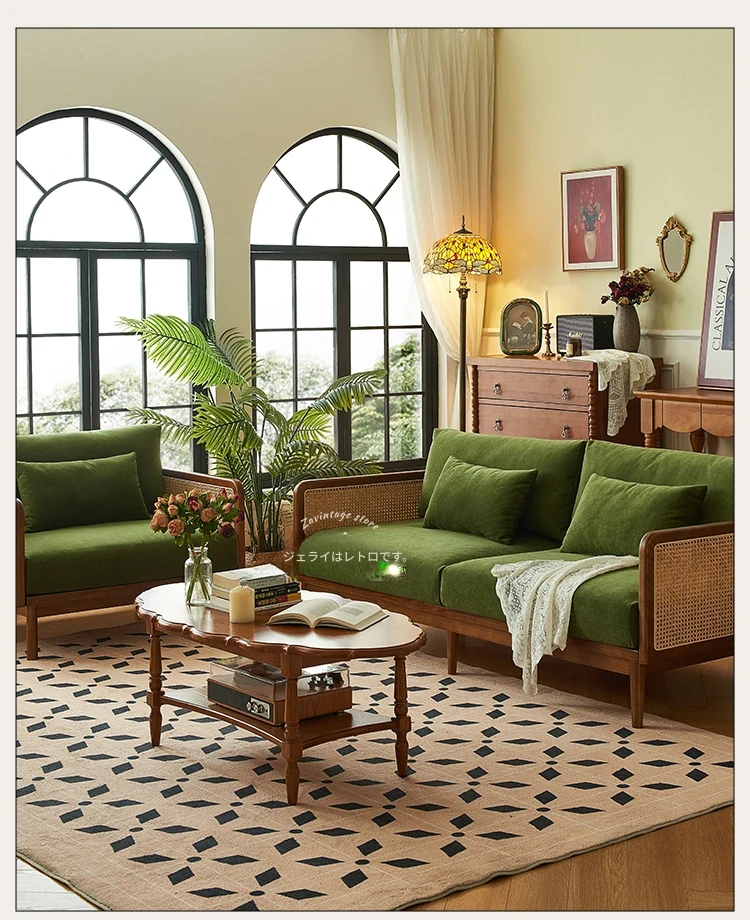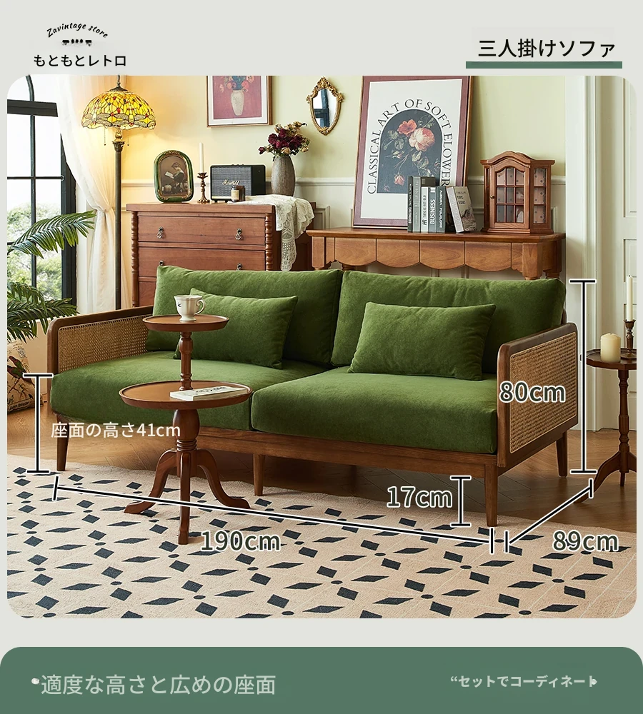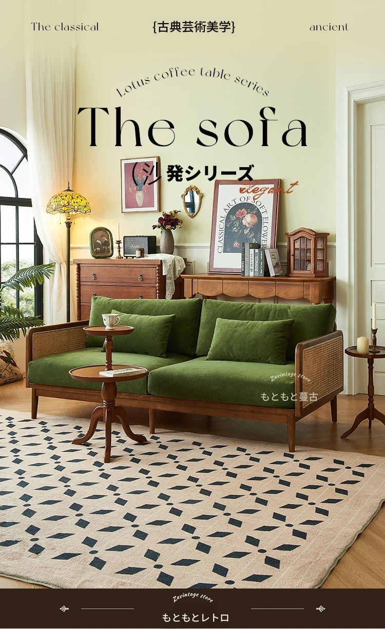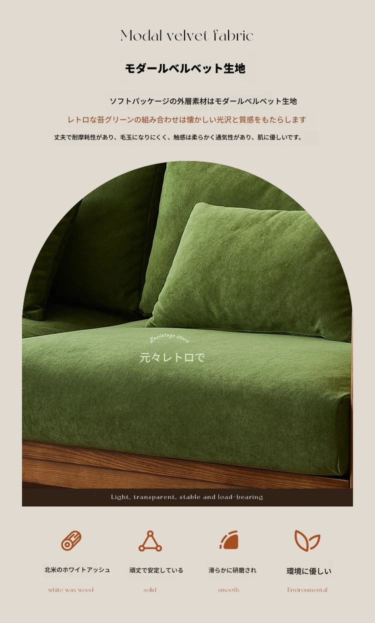 フレンチヴィンテージスタイルの小型リビング向け3人掛けソファ - グリーンベルベット×無垢材のダイレクトデザイン!おしゃれでコンパクト、あなたのリビングにぴったりの癒し空間を提供します。