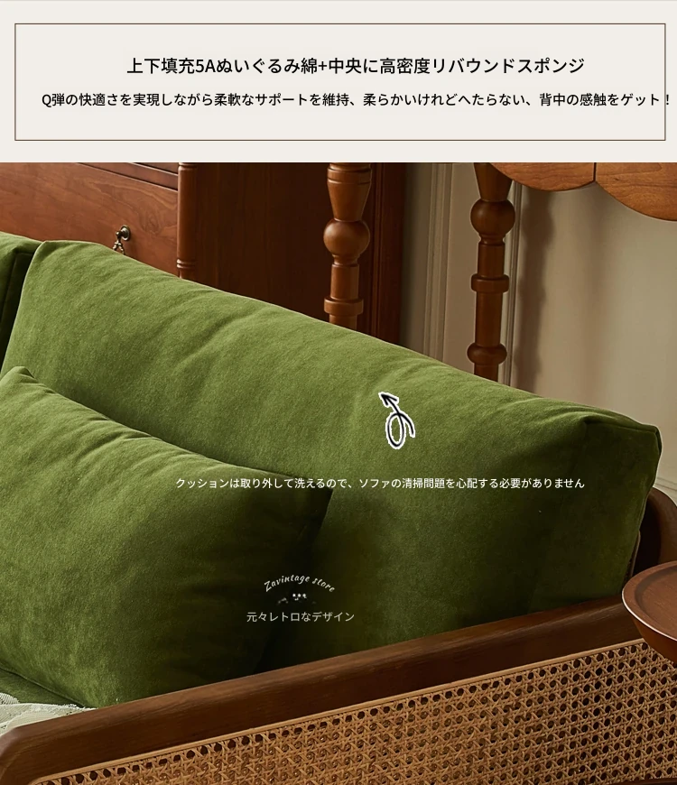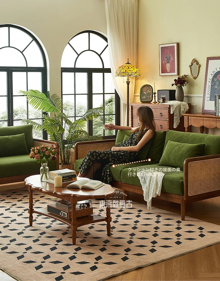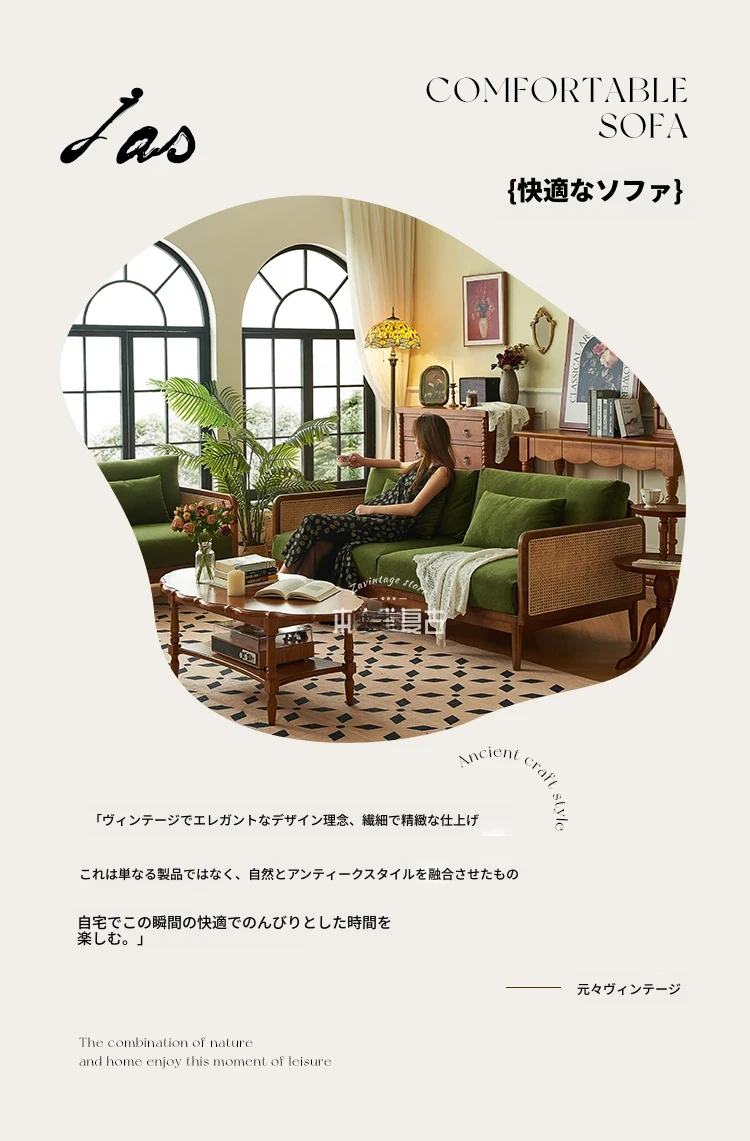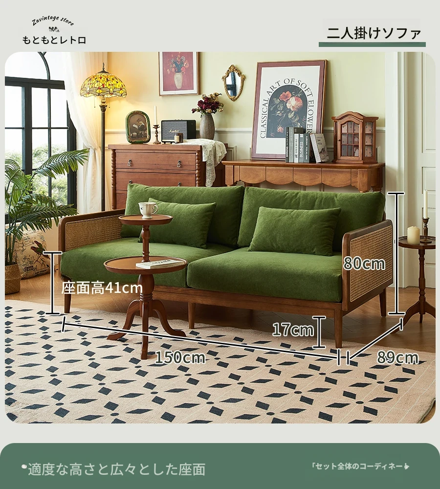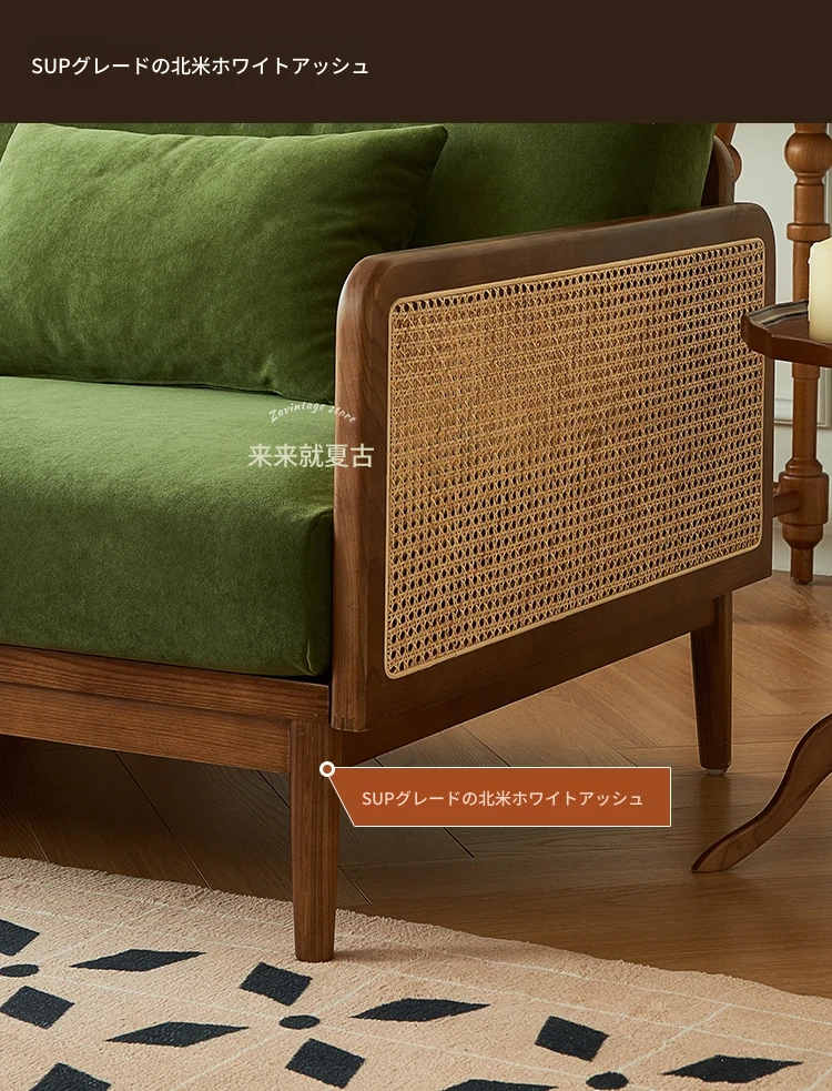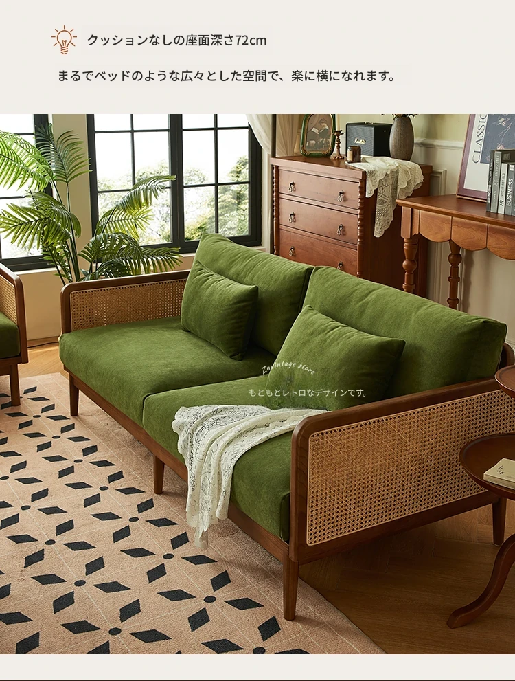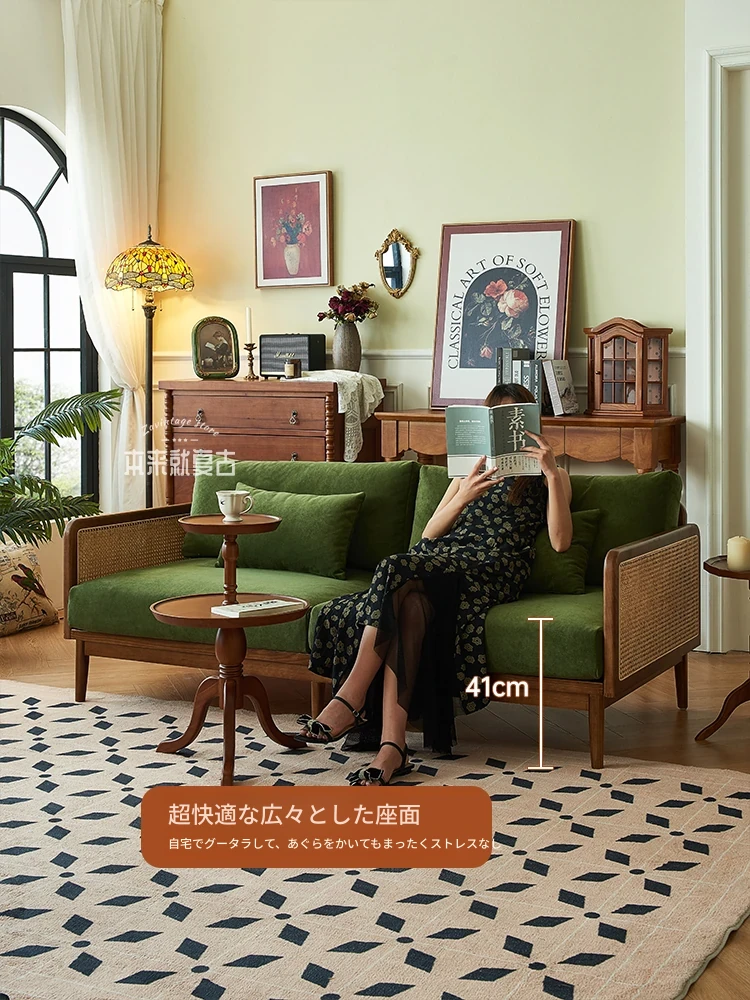 フレンチヴィンテージスタイルの小型リビング向け3人掛けソファ - グリーンベルベット×無垢材のダイレクトデザイン!おしゃれでコンパクト、あなたのリビングにぴったりの癒し空間を提供します。