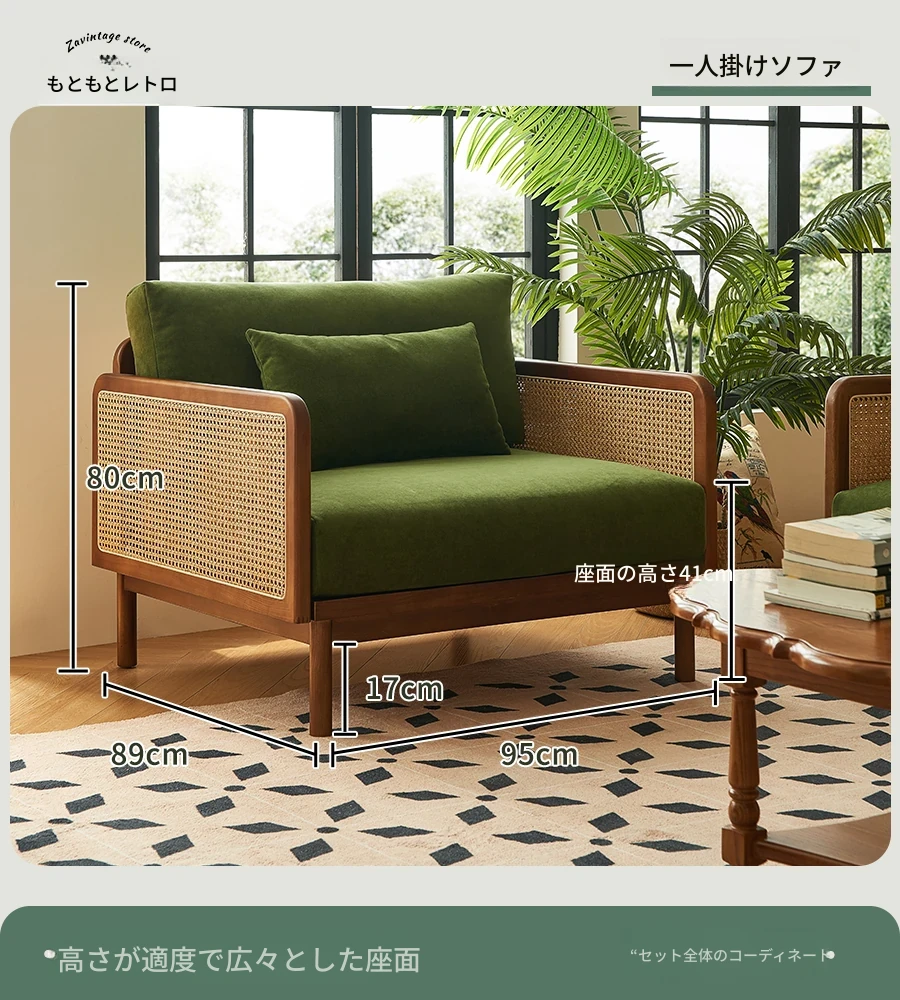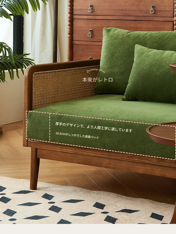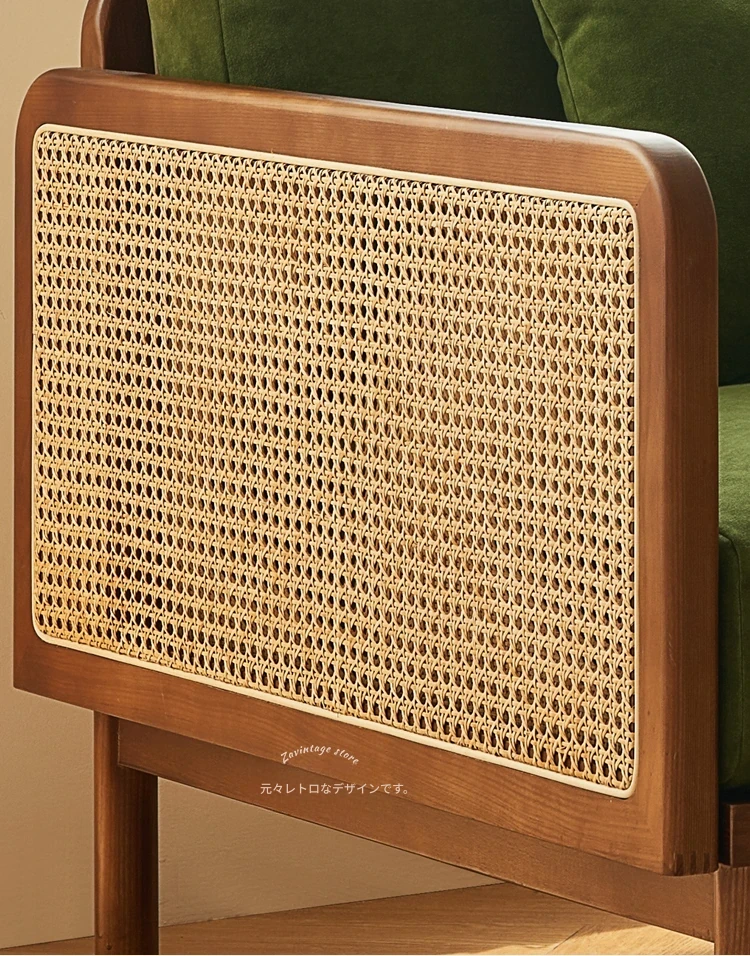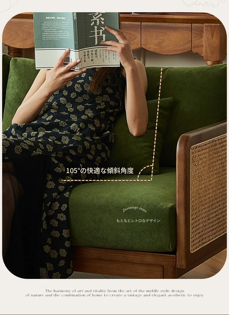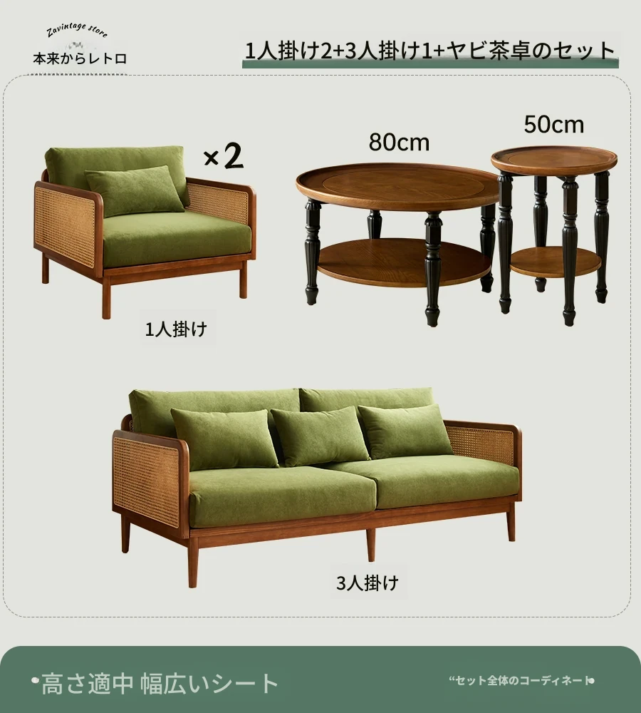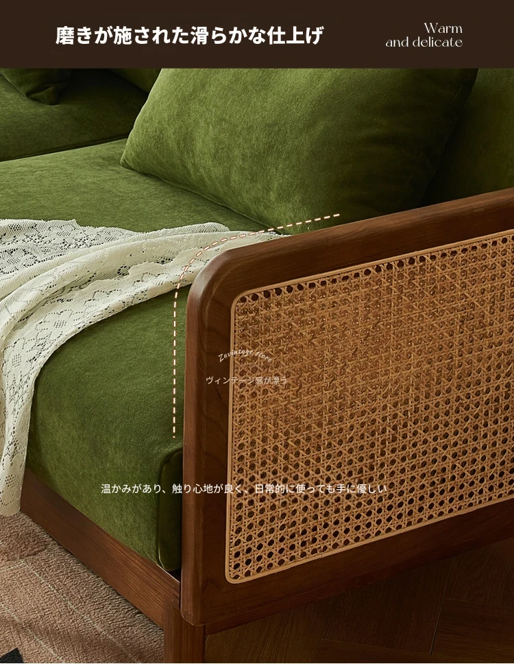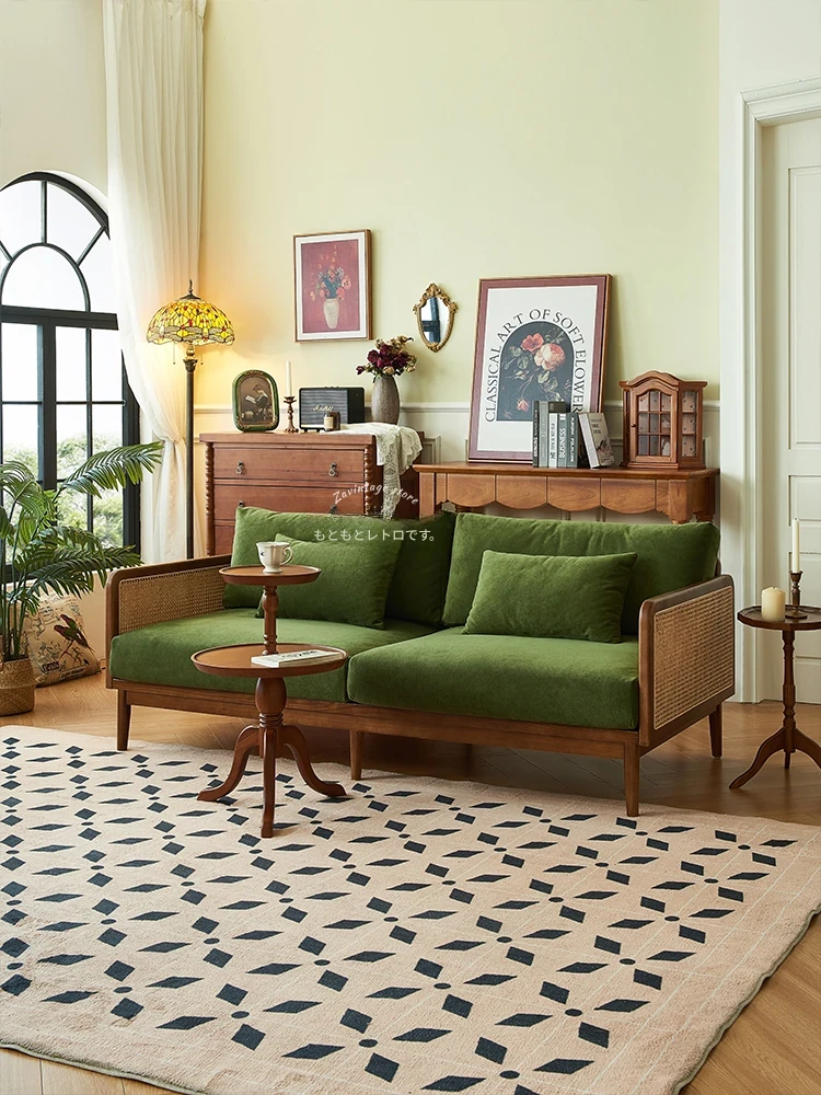 フレンチヴィンテージスタイルの小型リビング向け3人掛けソファ - グリーンベルベット×無垢材のダイレクトデザイン!おしゃれでコンパクト、あなたのリビングにぴったりの癒し空間を提供します。