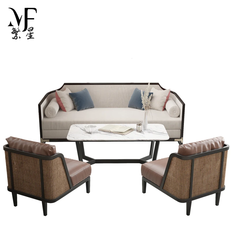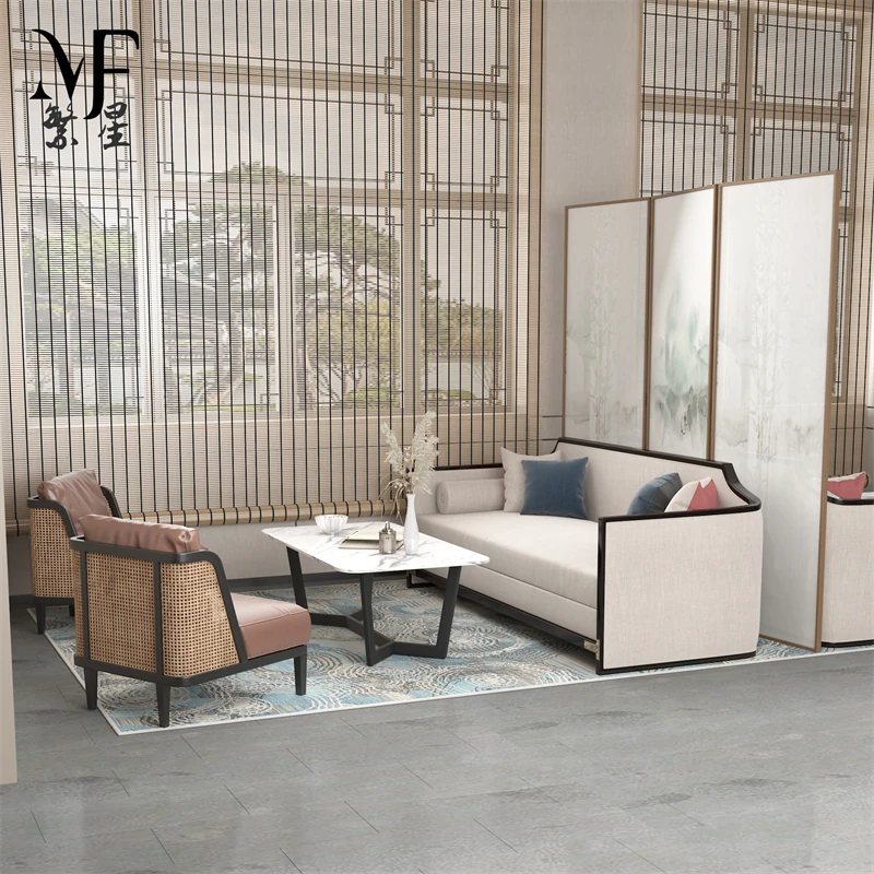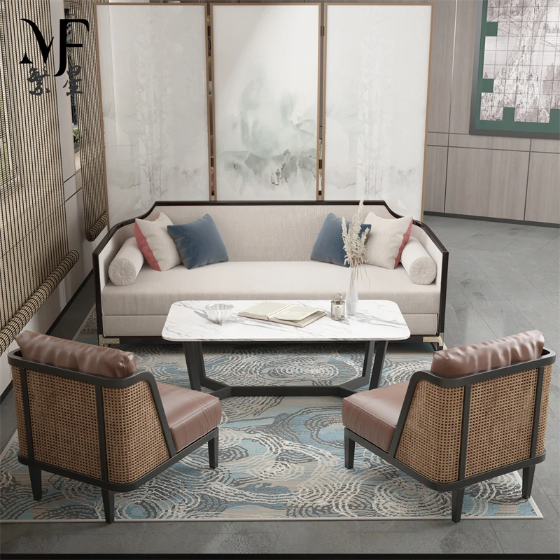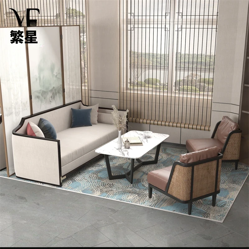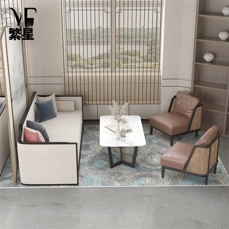 新中式スタイルのホテルロビー用接待ソファとテーブルのセット - 商談やリラックスに最適な会議スペースを演出!高級感溢れるデザインで、ゲストをおもてなし。