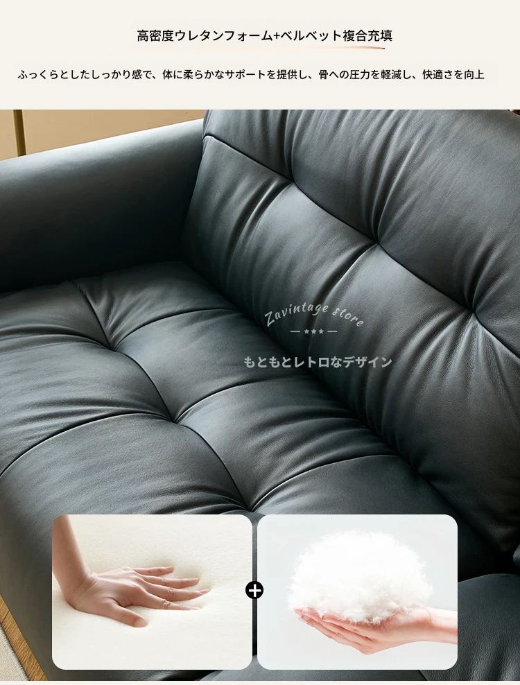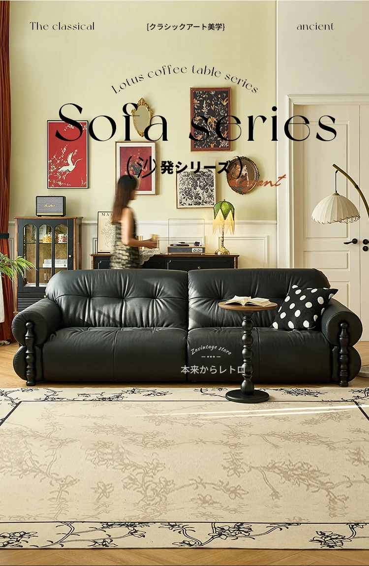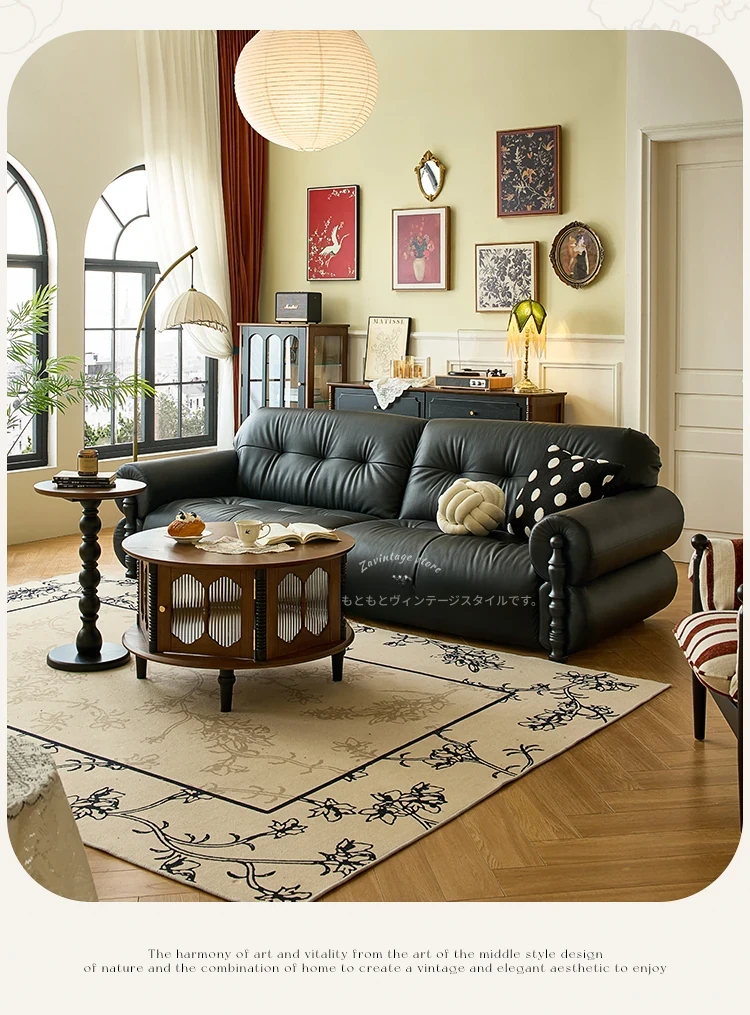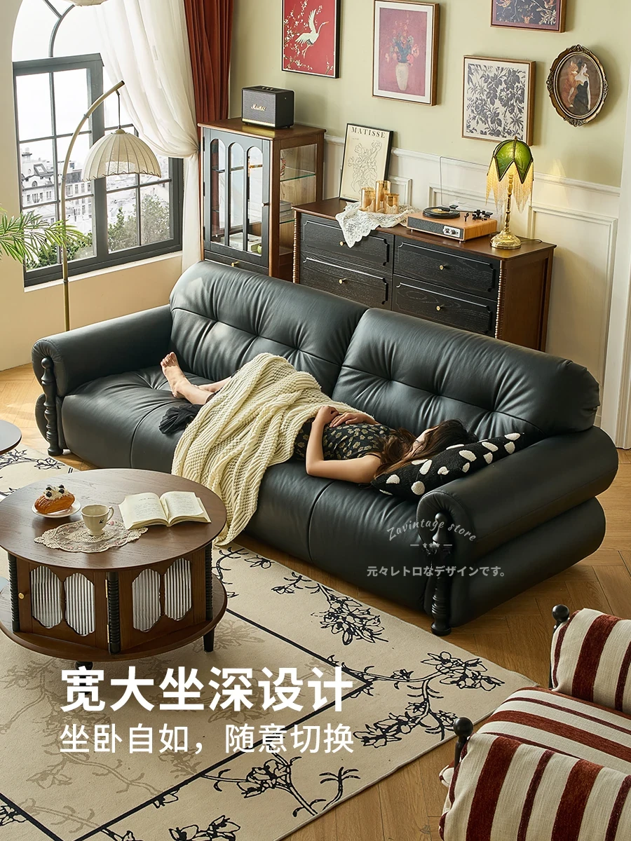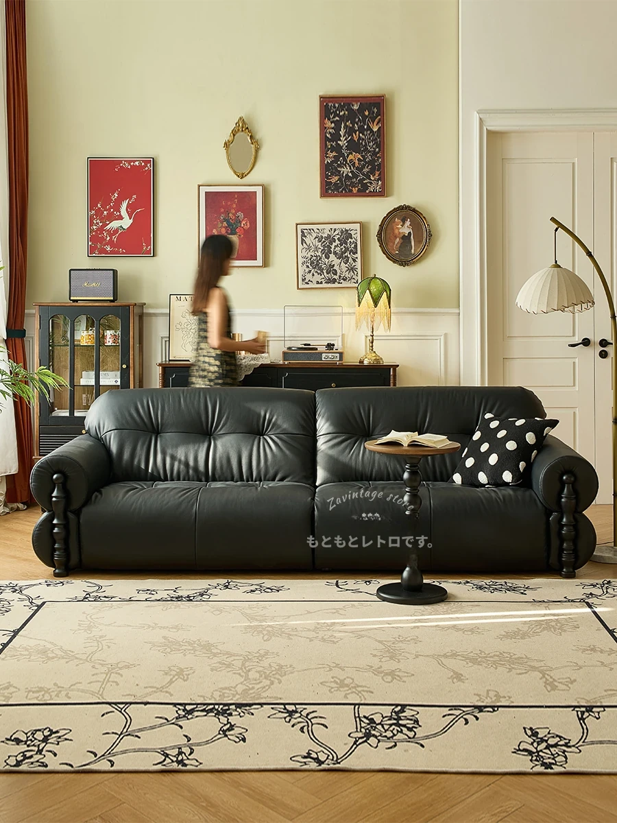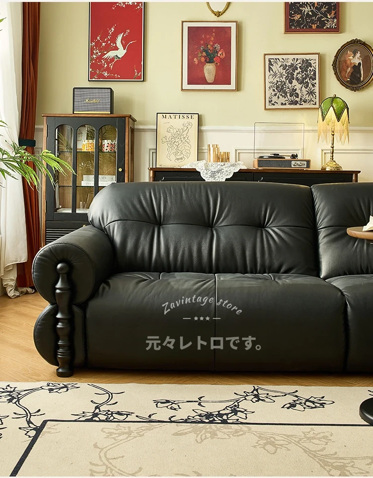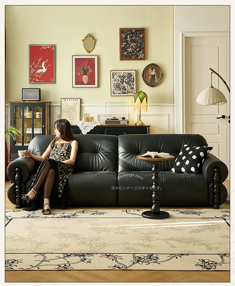フレンチビンテージ本革ソファ - ブラックシュガークラウドデザイン、スタイリッシュな直線的なフォルムで、洗練されたアメリカンスタイルのリビングルームにぴったりのクリエイティブソファ!