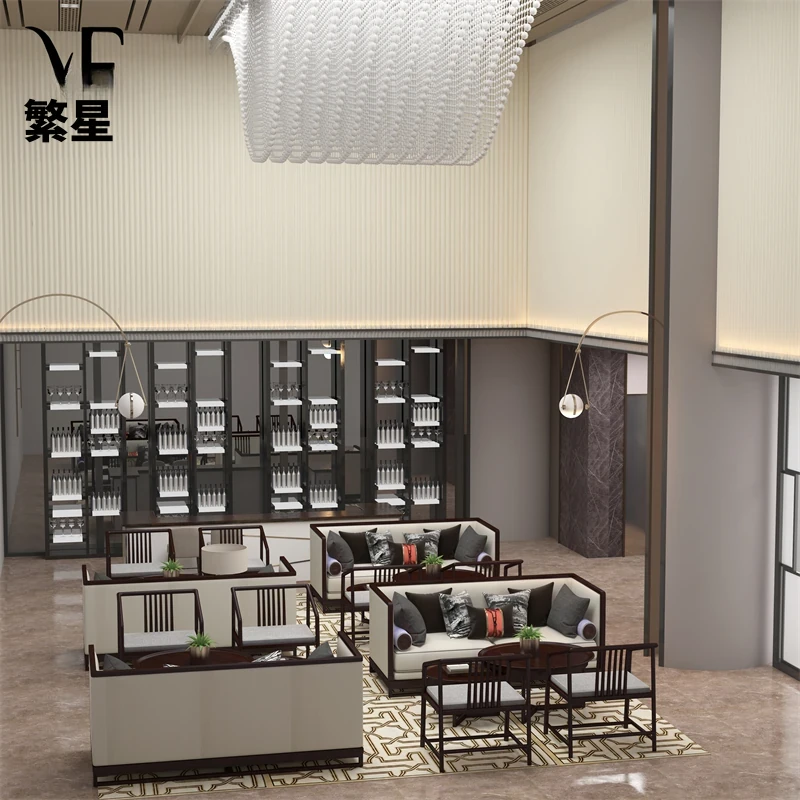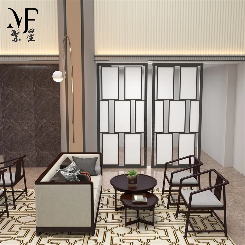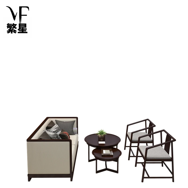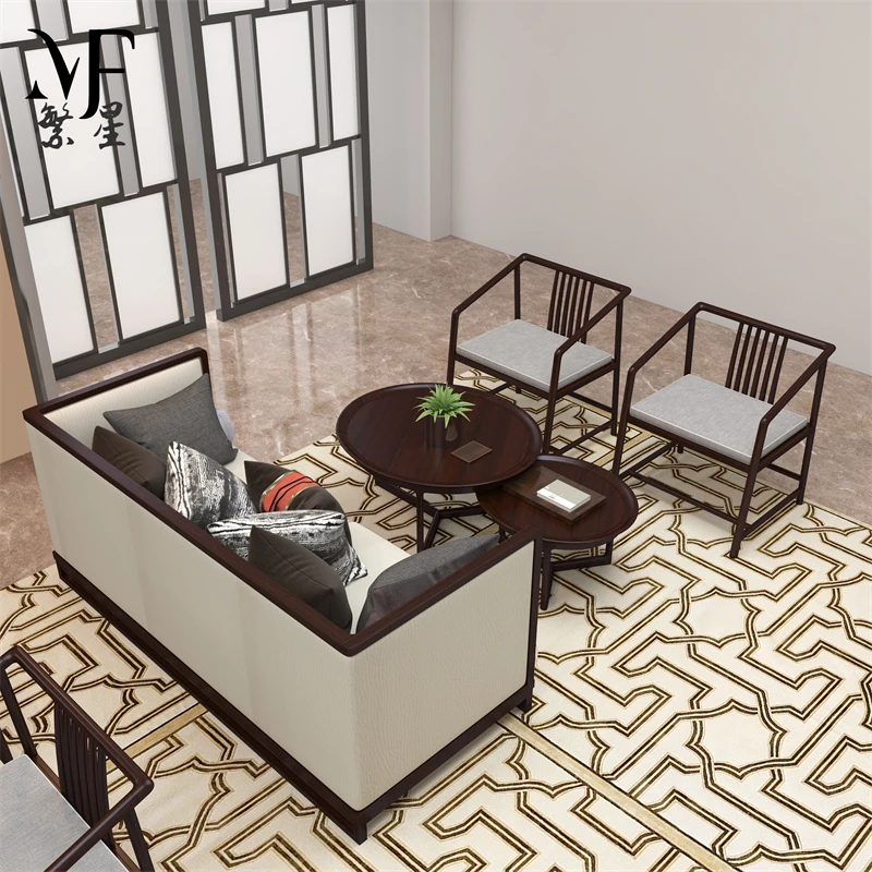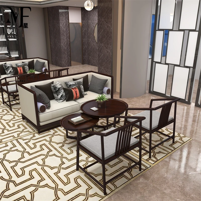 モダンミニマリスト禅スタイルのリビングルーム別荘サンプルルーム、軽奢な無垢材ソファ家具の新中式スタイルのソファセットで、心安らぐ空間を演出します。