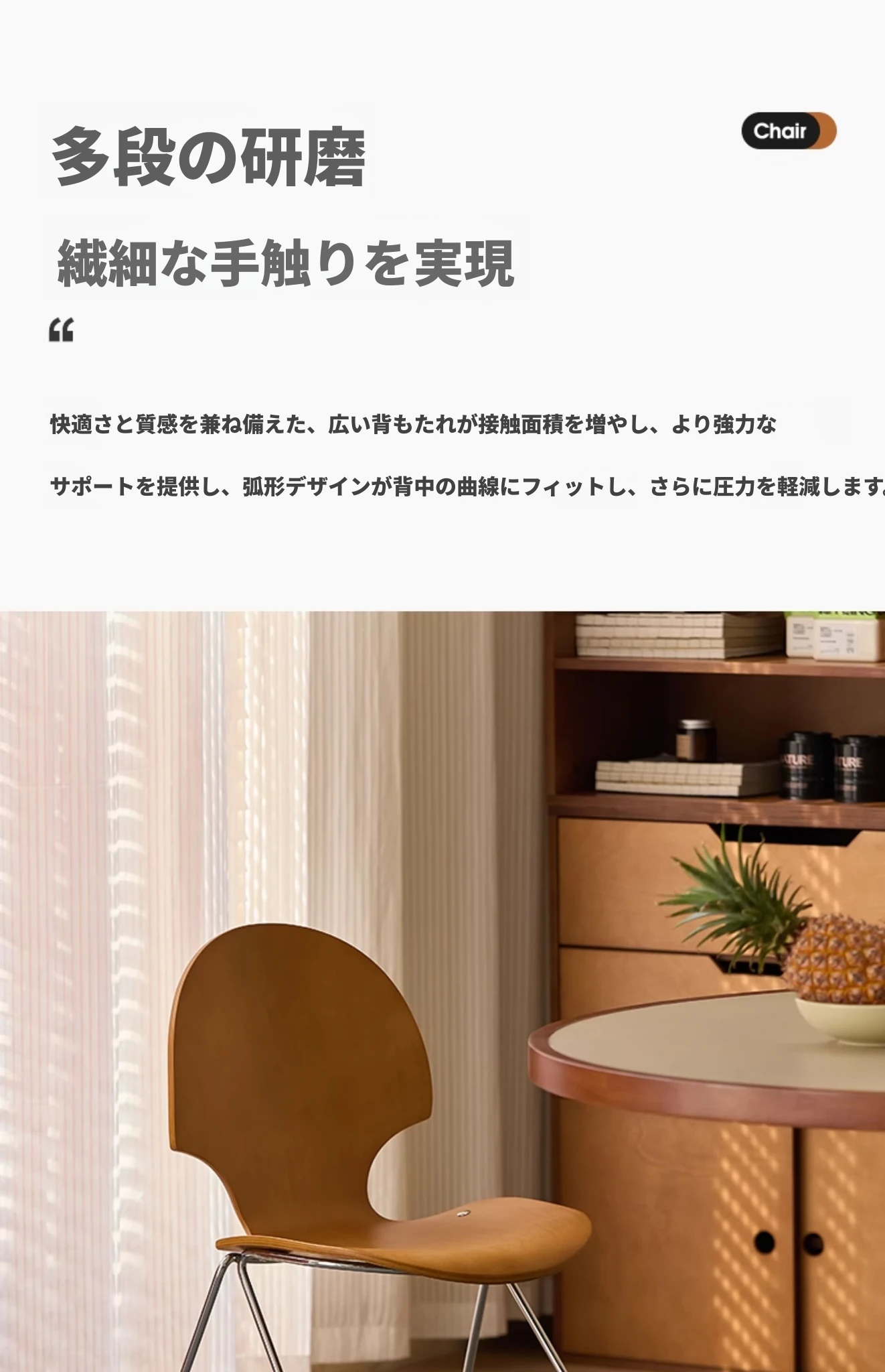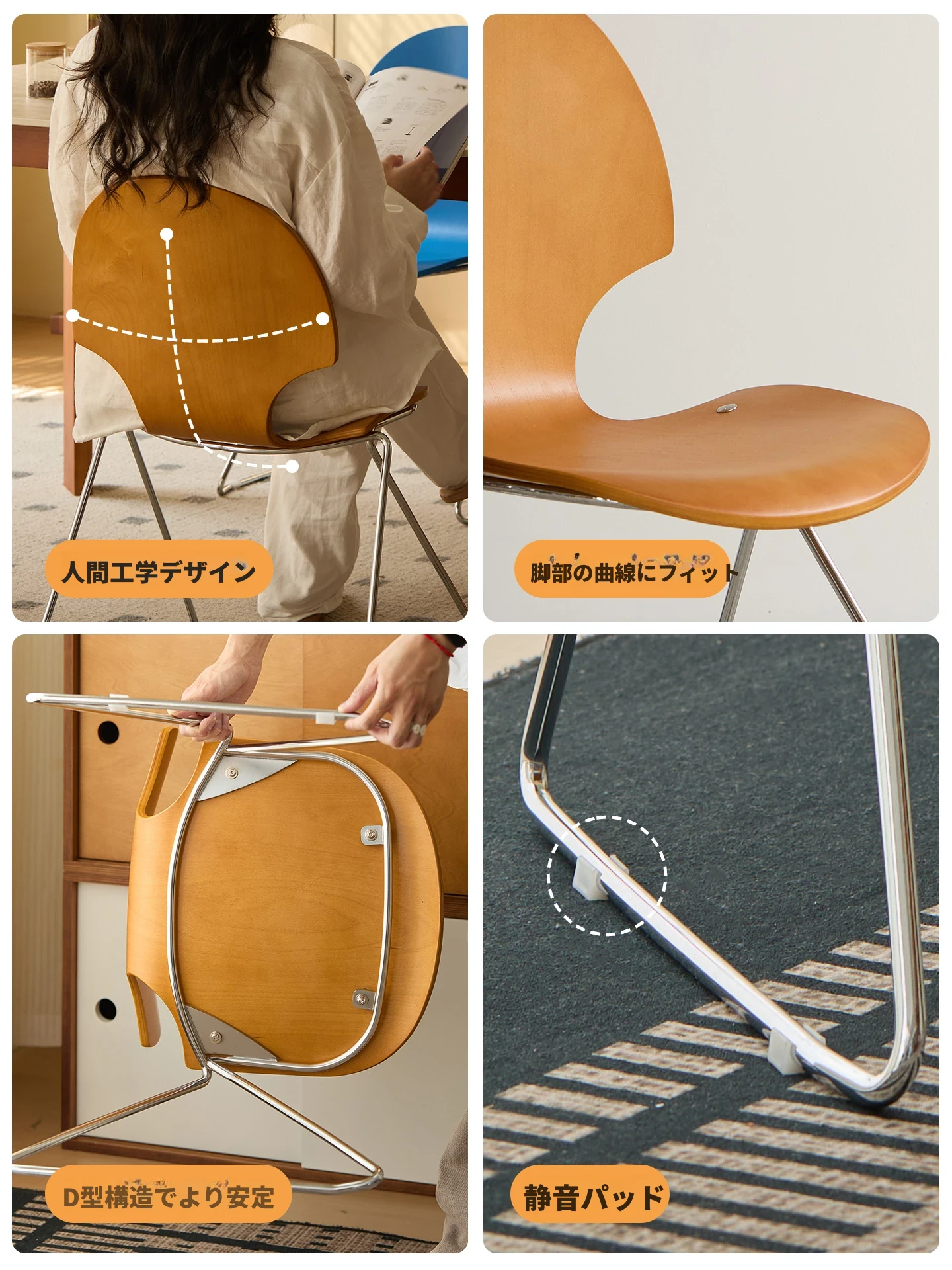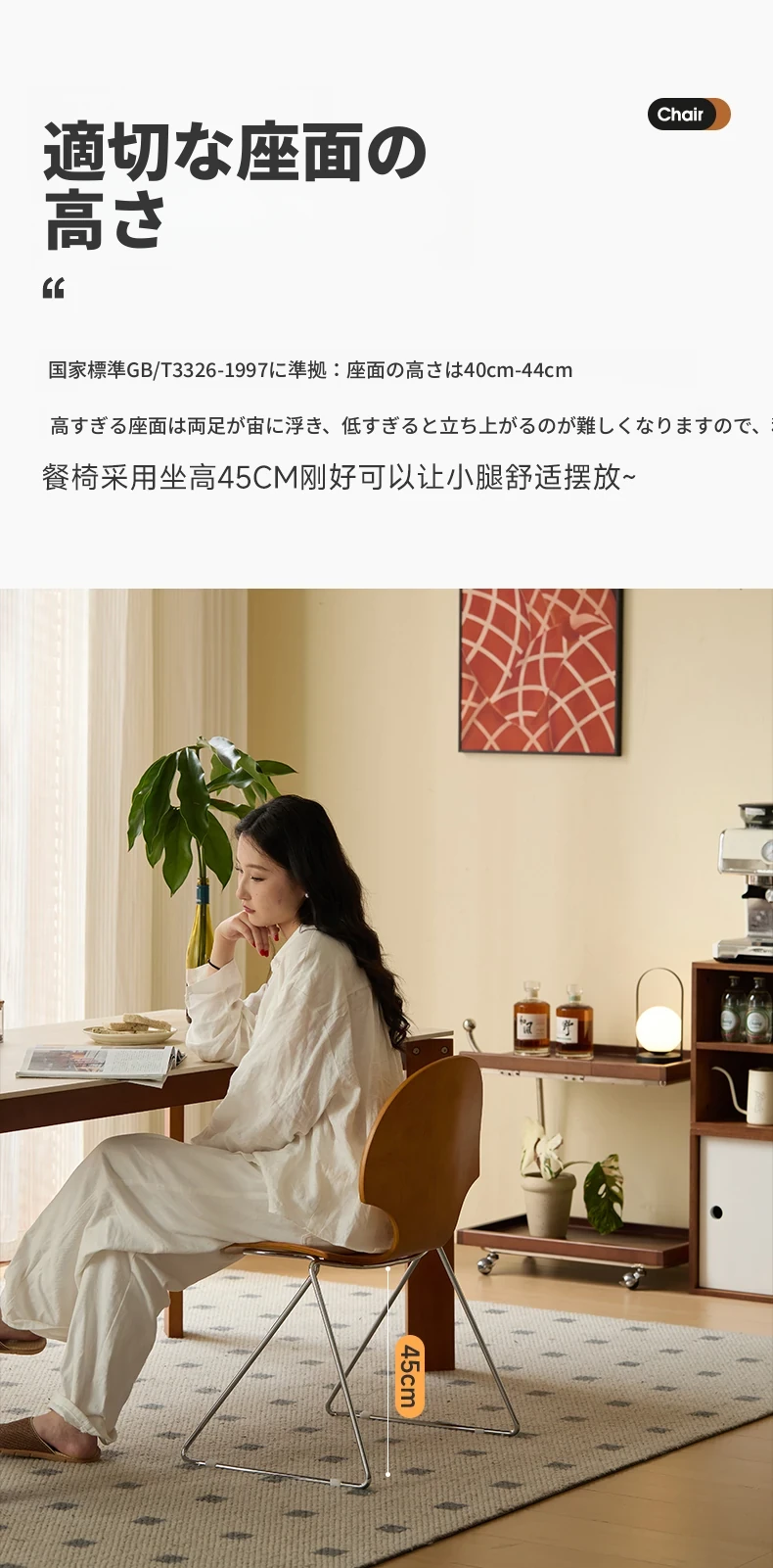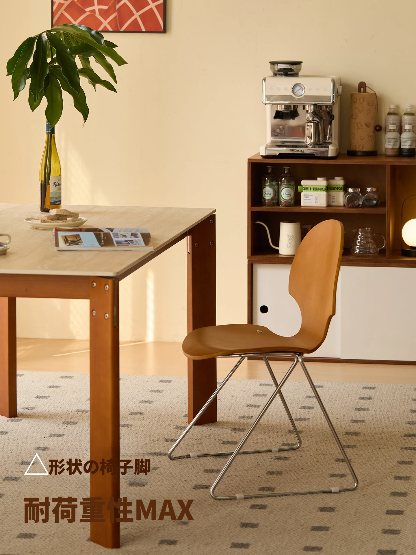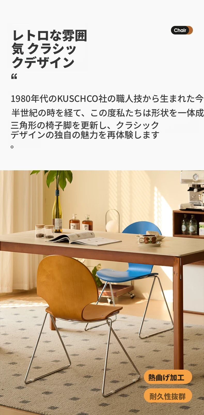 新しいスペース|杏の葉のデザインが魅力的な中古バウハウス風の無垢材ダイニングチェア。北欧のレトロなデザインで、家庭の食卓に華やかさをプラス!快適な背もたれ付きで、食事の時間をより特別に。