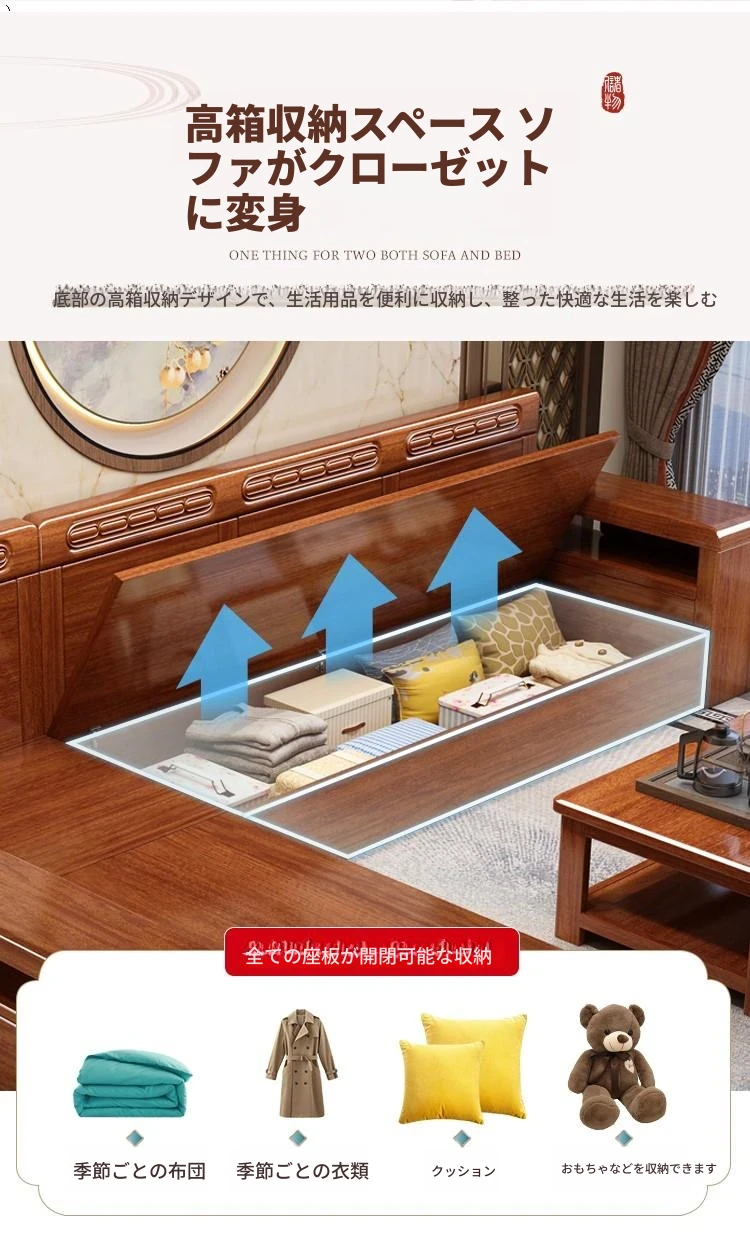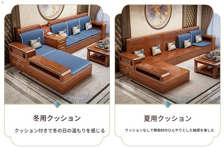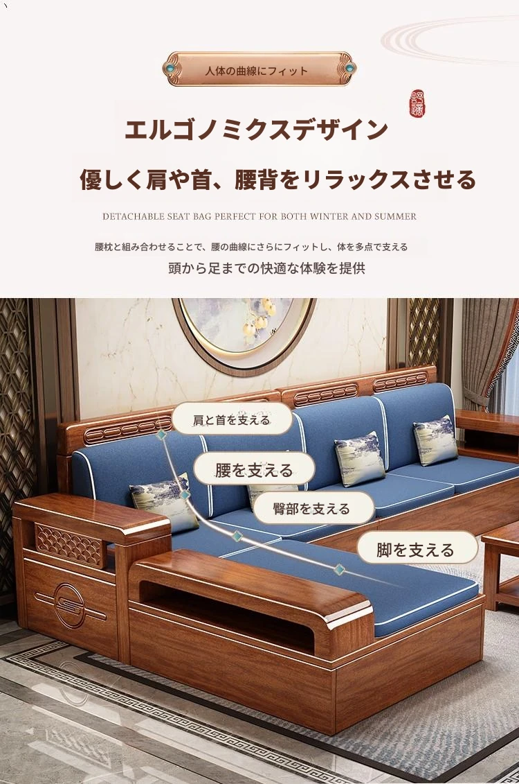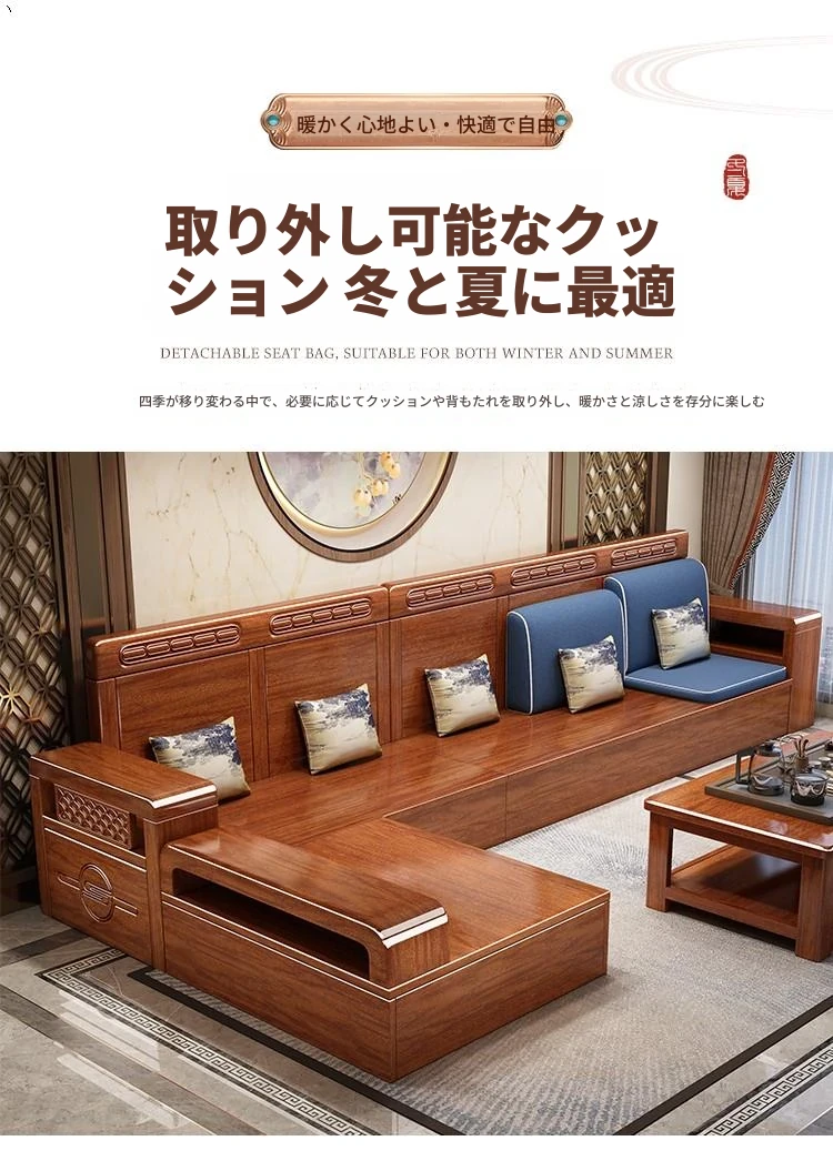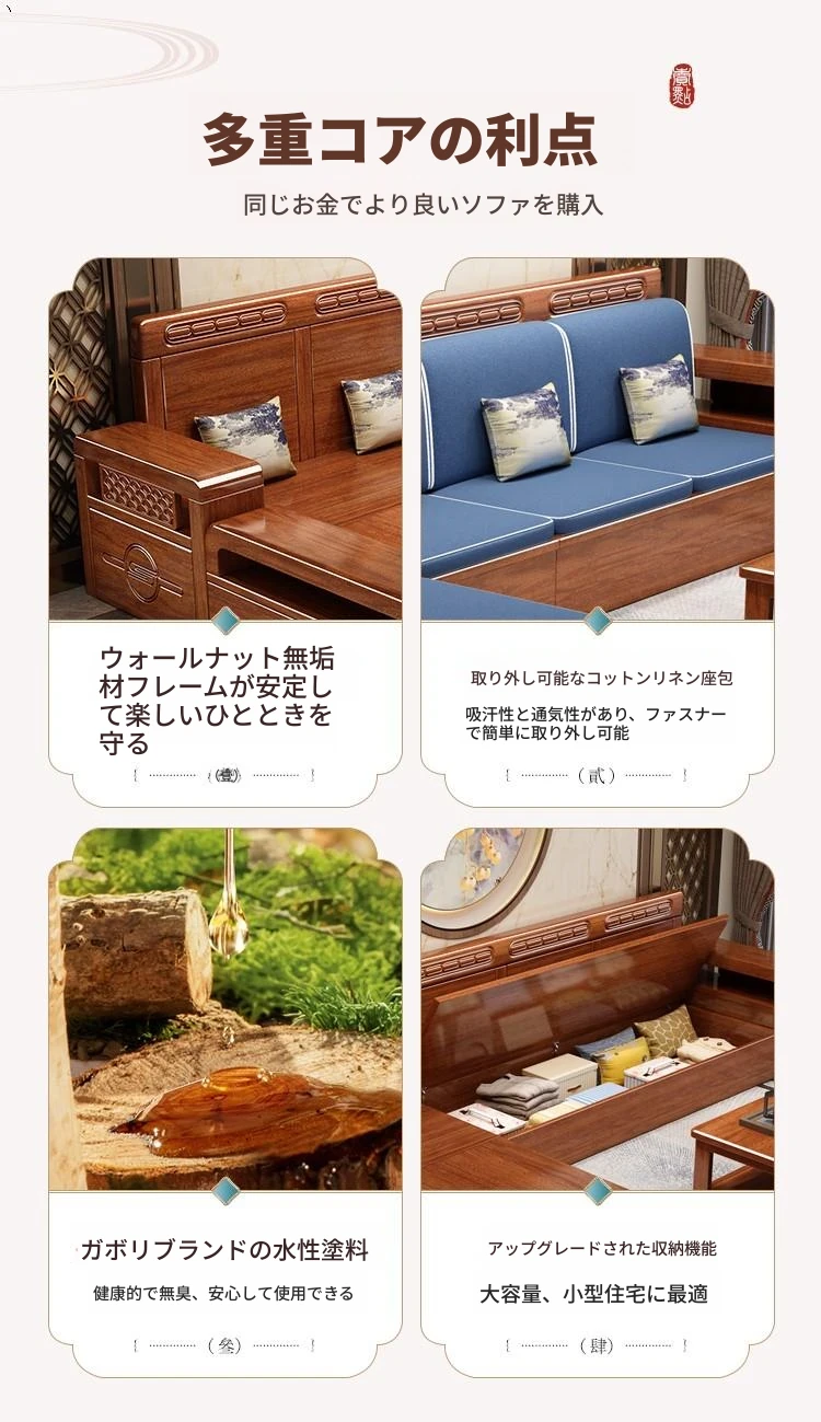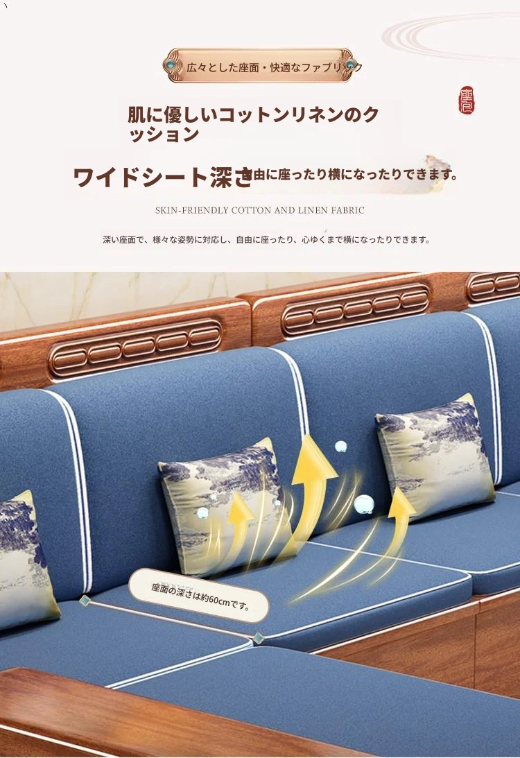 全実木製ソファー|新しい中華スタイルのリビング用|冬夏兼用の収納付きコンパクトな布製木製ソファー|小さな家にぴったり!快適な空間を演出し、スタイリッシュなインテリアを実現します!