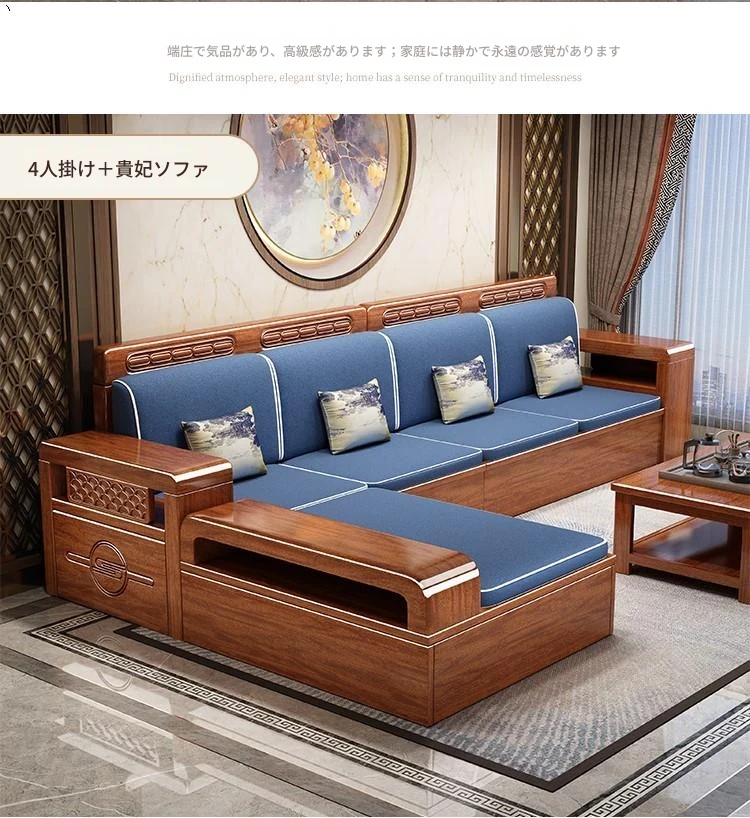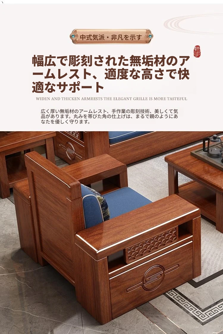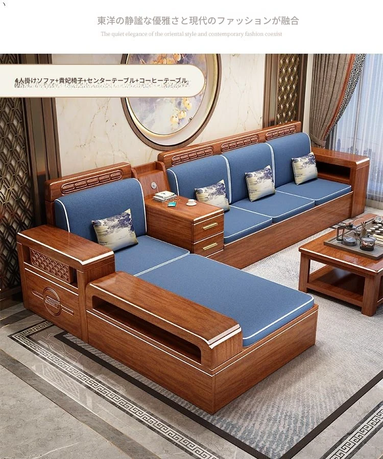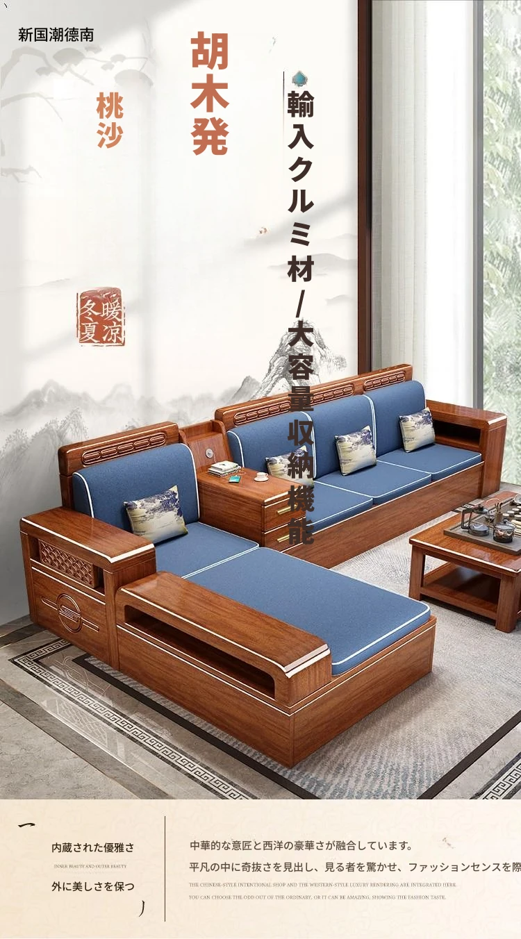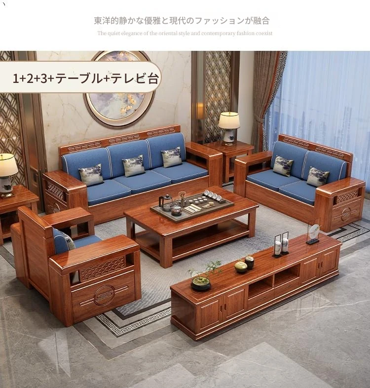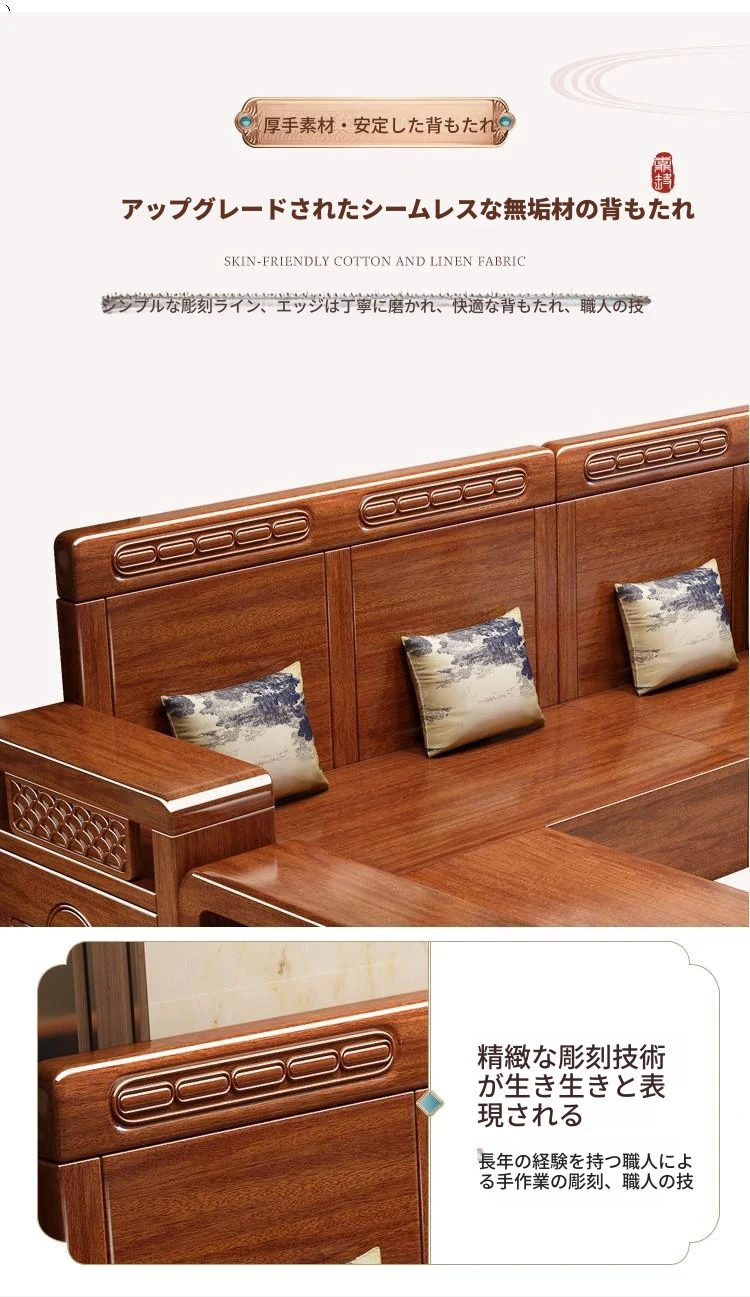 全実木製ソファー|新しい中華スタイルのリビング用|冬夏兼用の収納付きコンパクトな布製木製ソファー|小さな家にぴったり!快適な空間を演出し、スタイリッシュなインテリアを実現します!