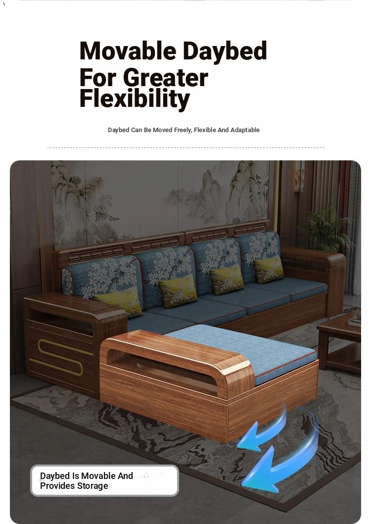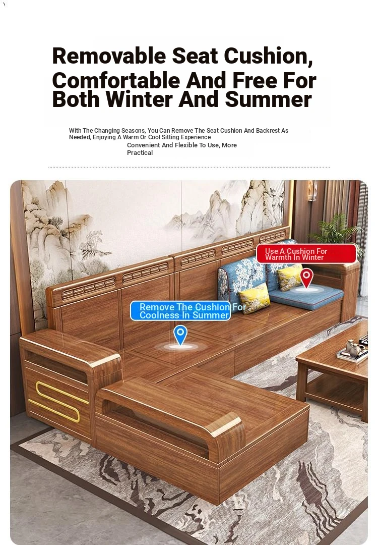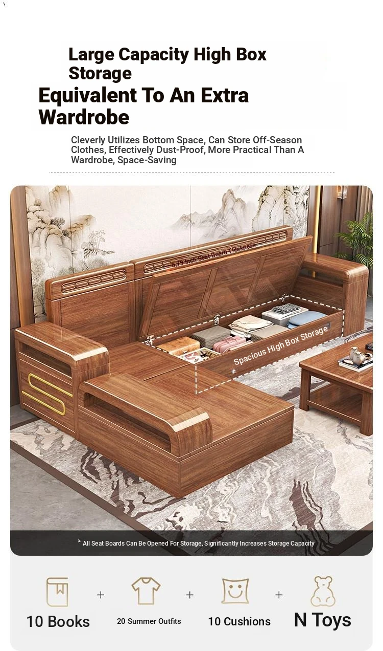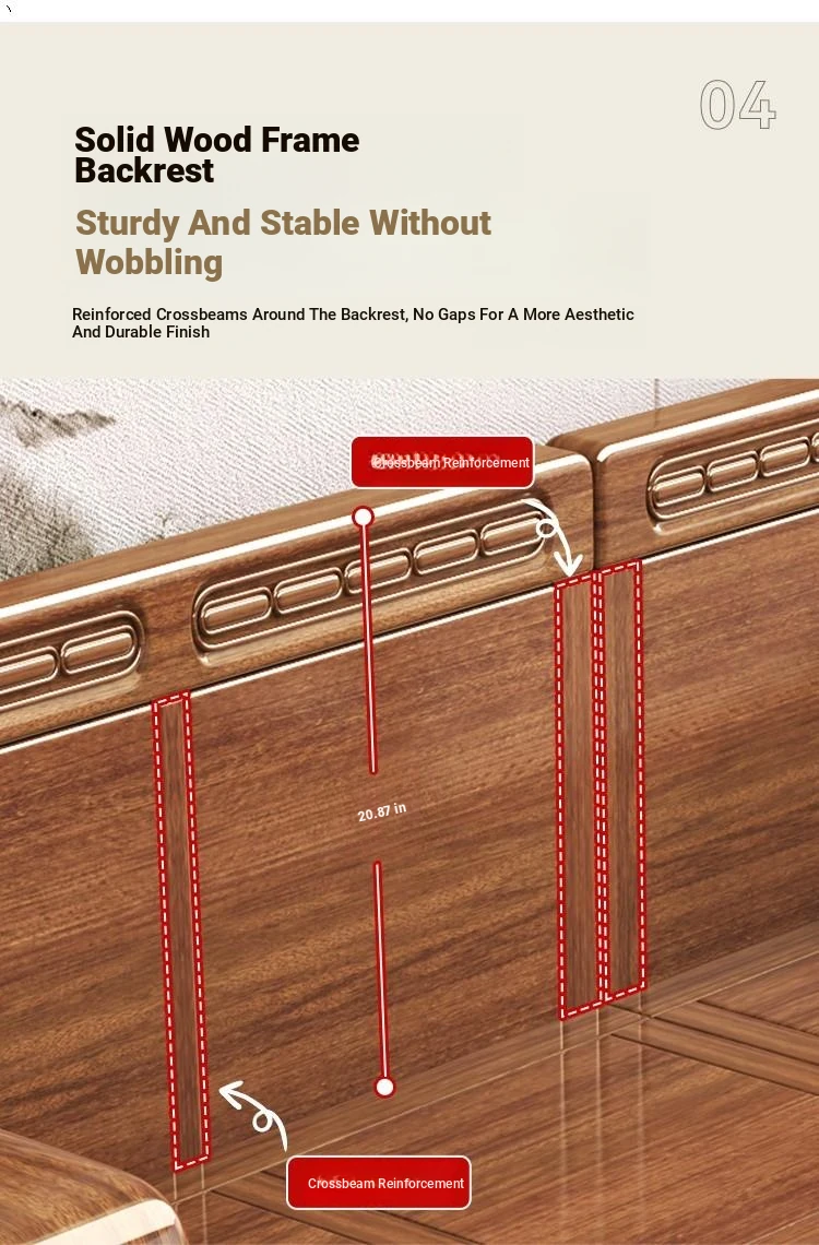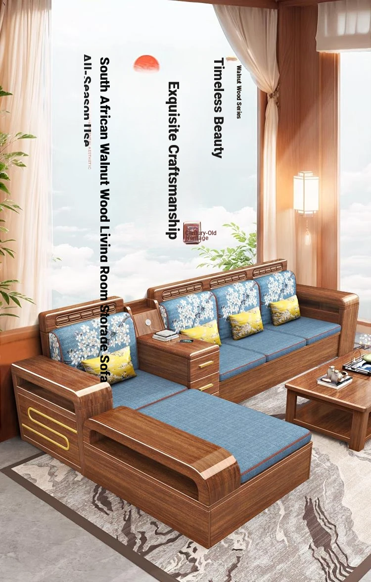 Walnut Solid Wood Sofa - All-wood Storage Chaise Lounge with Corner Design, Perfect for Winter and Summer, Made with Cotton and Linen